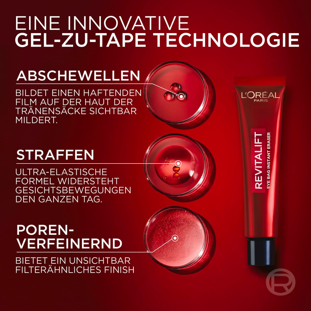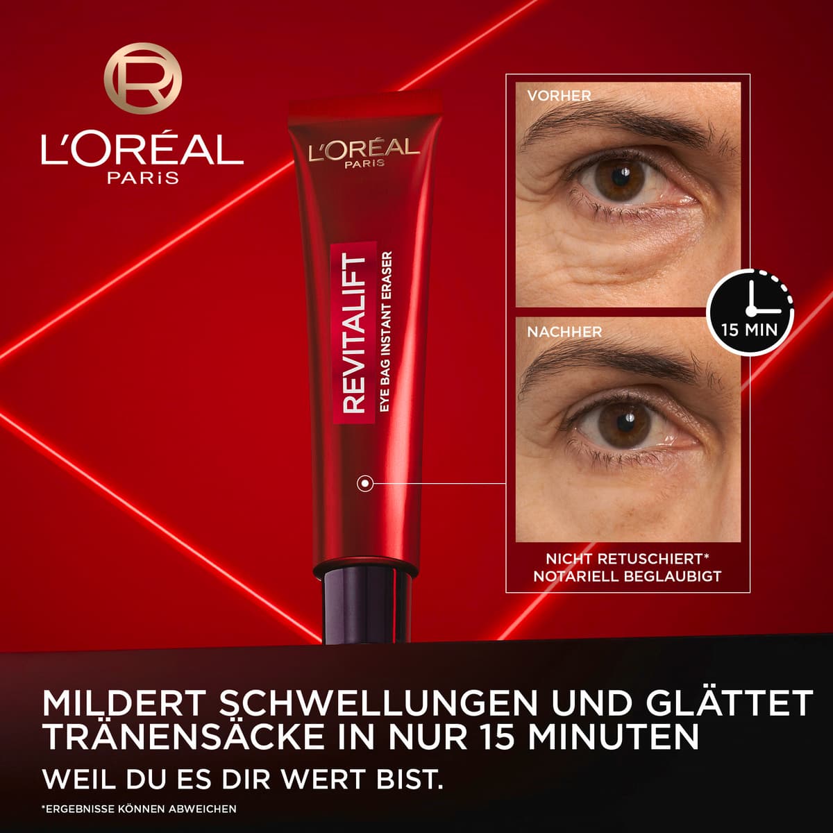 Der L’Oréal Paris Revitalift Laser Eye Bags Instant Eraser ist Teil der Revitalift Laser-Pflegeserie und ist speziell auf die Bedürfnisse der empfindlichen Augenpartie abgestimmt. In diesem Bereich ist die Haut wesentlich dünner als im restlichen Gesicht, sodass sich hier Anzeichen von Stress, Hautalterung und Müdigkeit eher bemerkbar machen. Mithilfe der speziellen Anti-Aging-Pflege wird die Haut dabei nicht nur mit Feuchtigkeit versorgt, sondern erhält auch zusätzlich mehr Festigkeit. Weiterhin mildert die leichte Formel Augenschwellungen und glättet innerhalb von nur 15 Minuten für einen strahlenden und jugendlicher aussehenden Blick. Dazu wirkt die Augen-Pflege Falten, Tränensäcken, Schwellungen und Fältchen entgegen.