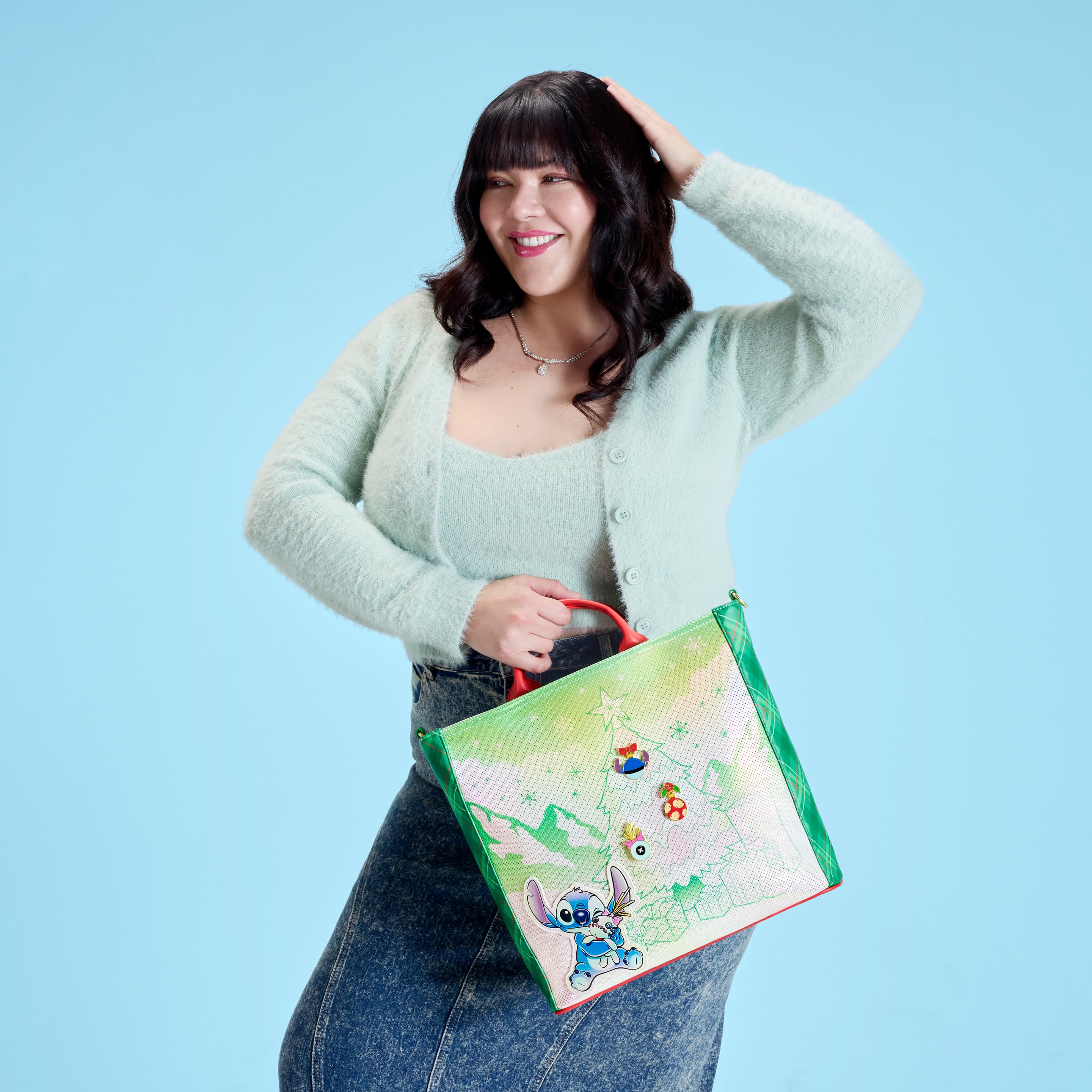 Auf dieser Tragetasche sitzt Stitch neben einem Weihnachtsbaum, umgeben von Geschenken. Die Vorderseite der Tasche besteht aus perforiertem Kunstleder. Im Lieferumfang dieser Tasche sind Emaille-Pins in Form von Christbaumkugeln enthalten. Sie können die Pins an dem perforierten Kunstleder befestigen und den Baum schmücken! Die Seiten der Tasche sind mit einem weihnachtlichen Karomuster verziert, und auf der Rückseite der Tasche sind mehrere Weihnachtssymbole wie Christbaumkugeln und Schneeflocken auf einem perlmuttfarbenen Material abgebildet.