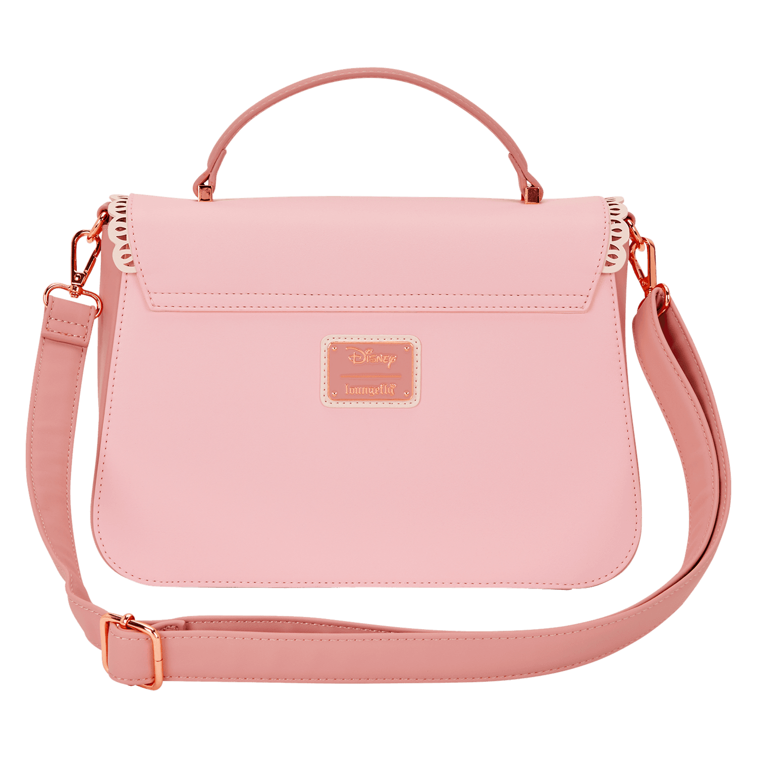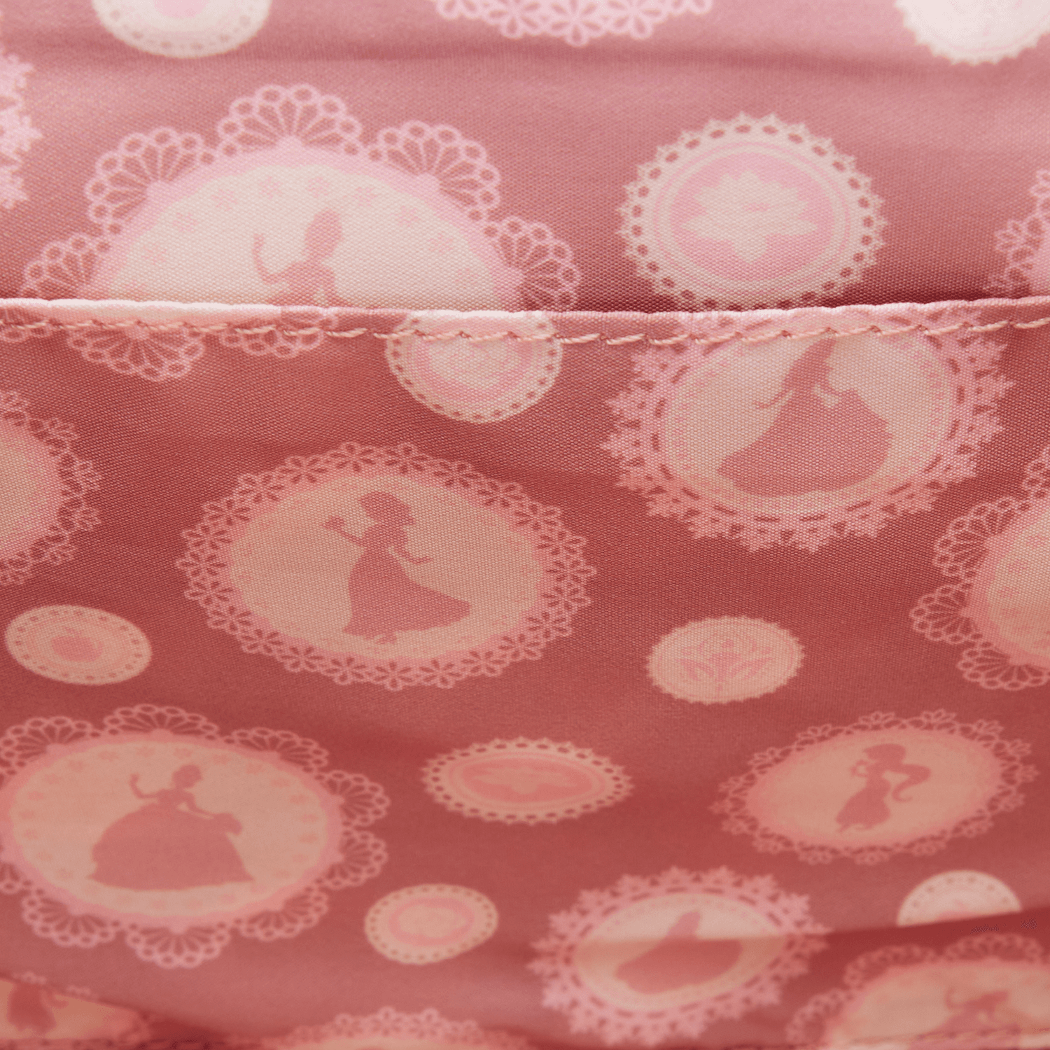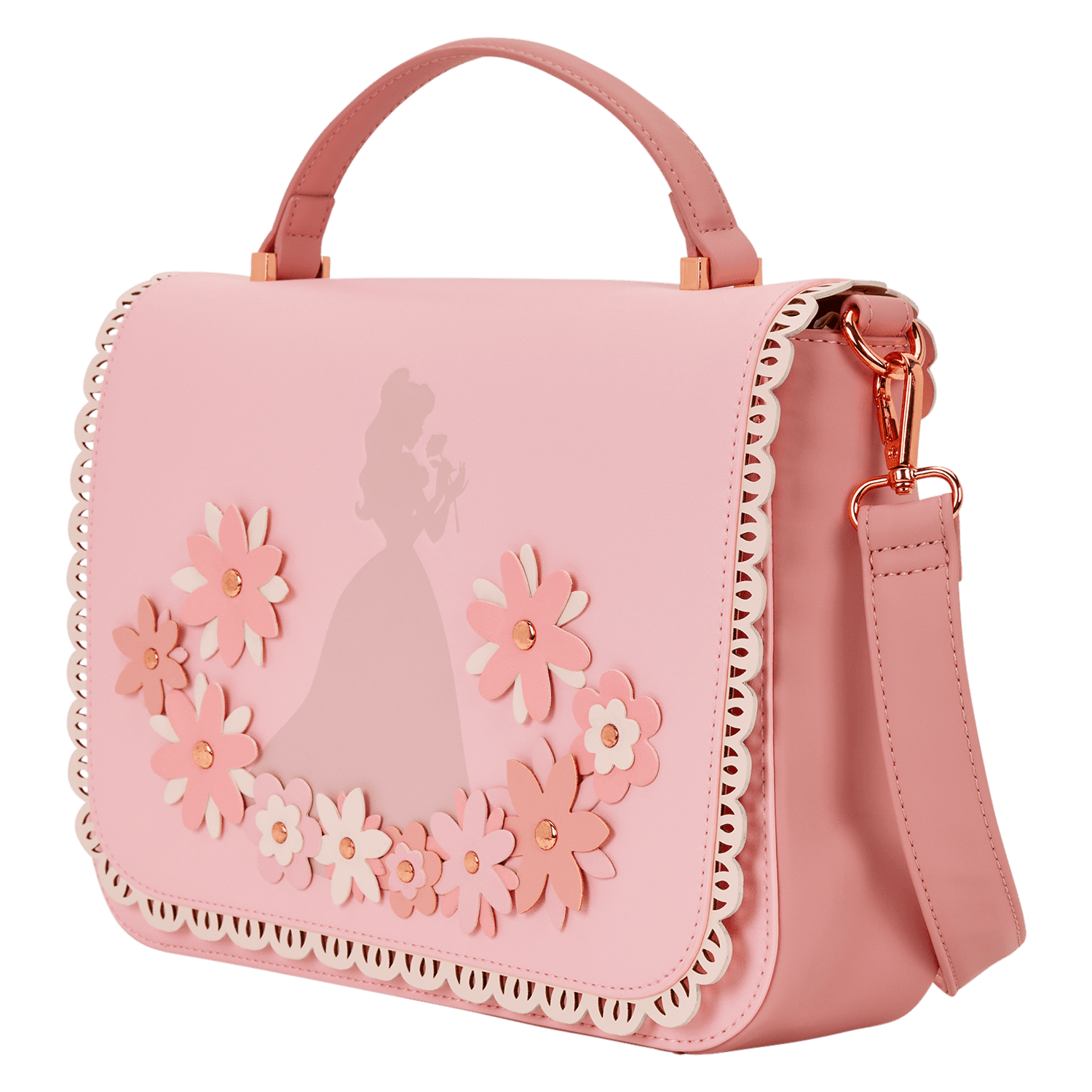 Diese Umhängetasche zeigt eine Silhouette von Belle, die eine Rose hält. Sie ist von 3D-Blumen umgeben. Auf der vorderen Klappe der Tasche finden Sie spitzenartige Details. Am oberen Griff ist außerdem eine Satinschleife angebracht! Im Inneren befindet sich ein supersüßes Innenfutter mit verschiedenen Silhouetten von Disney-Prinzessinnen.
