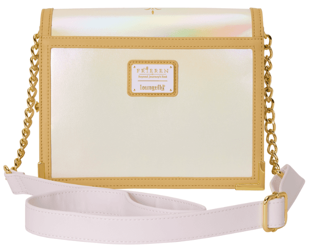 Erlebe die Magie von Frieren: Beyond Journey's End mit der exklusiven Loungefly Crossbody Bag – ein Must-have für Anime-Fans und Fashion-Liebhaber! Diese edle Umhängetasche kombiniert stilvolles Design mit ikonischen Elementen aus der beliebten Serie. Die Tasche glänzt in einem eleganten Gold-Weiß-Farbton mit irisierendem Finish und zeigt auf der Front einen 3D-geformten Stab von Frieren sowie ein goldenes Siegel auf der Klappe.