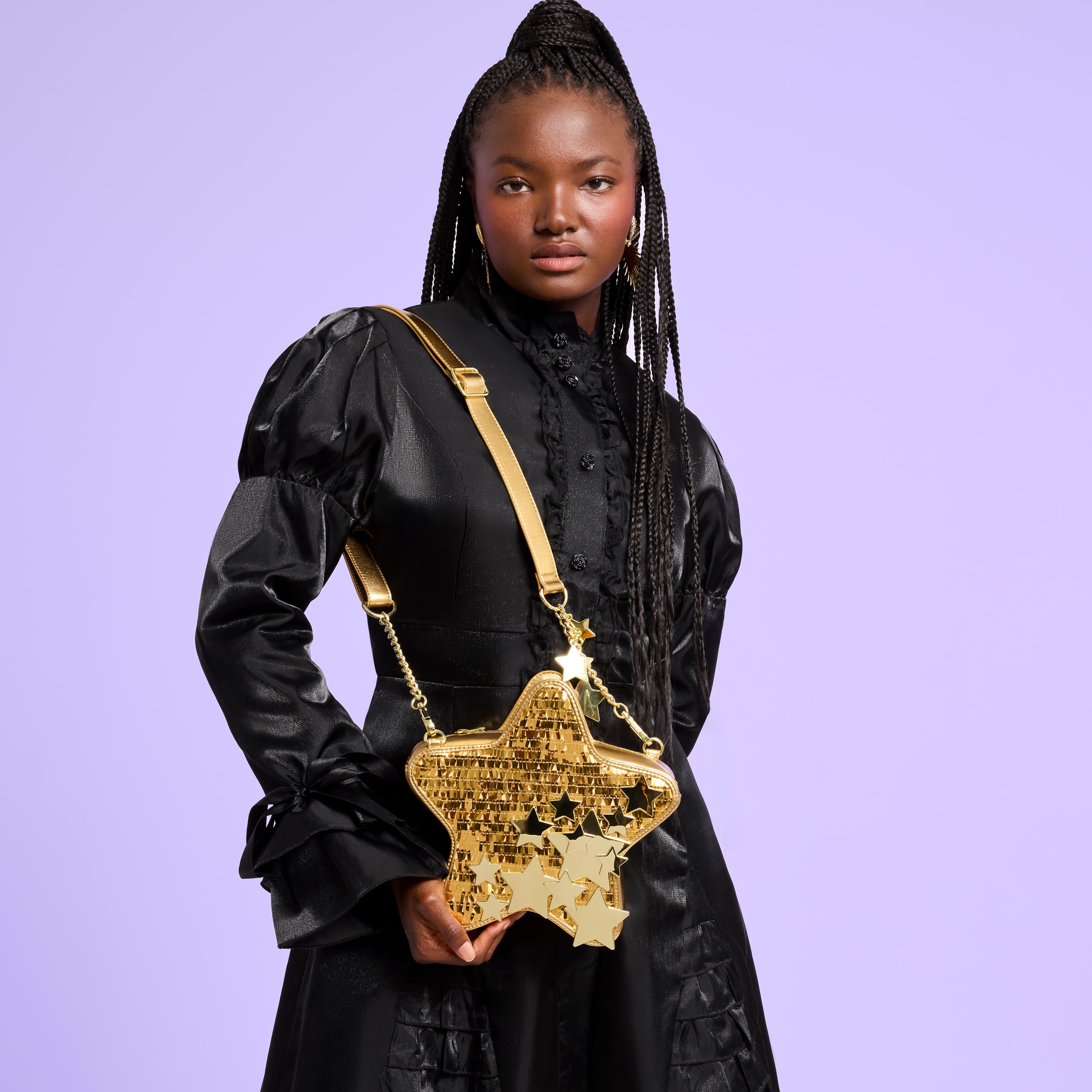 Diese Umhängetasche hat die Form eines Sterns. Sie ist mit goldenen Pailletten und geformten Metall-Sternanhängern verziert. Sogar am Umhängeriemen finden Sie Sternanhänger!