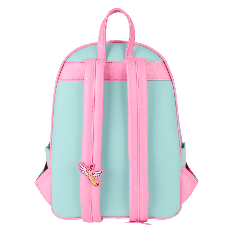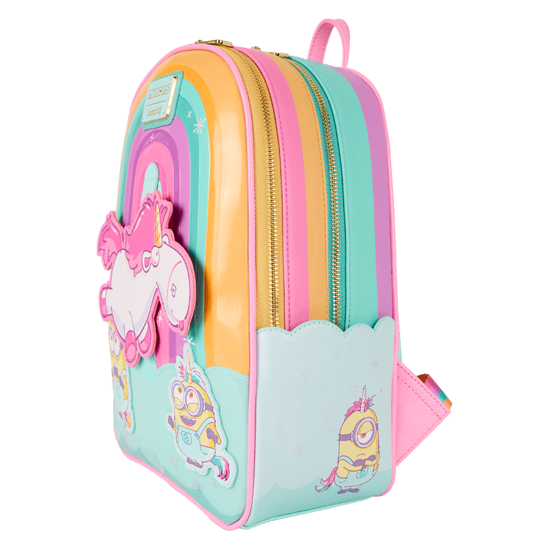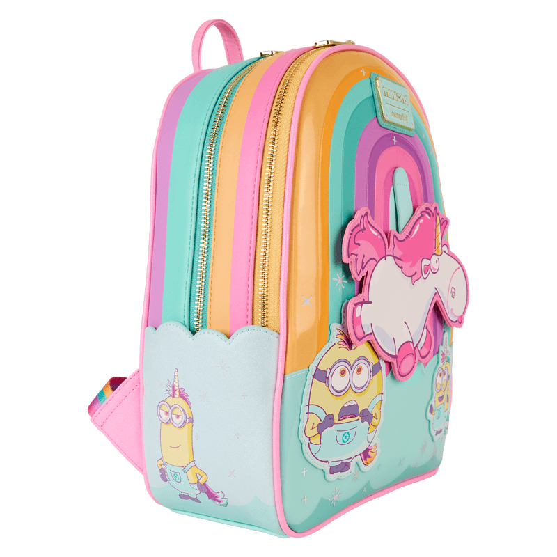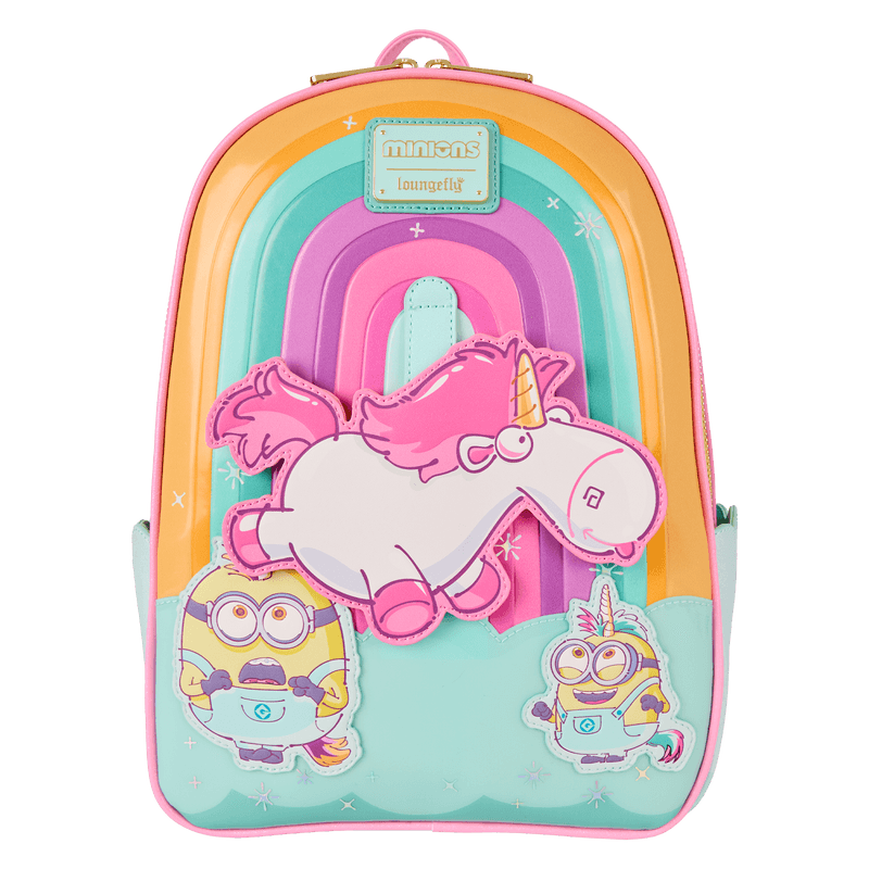 A rainbow background sets the scene on this bag. Floating above minions dressed as unicorns is Agnes' unicorn! It moves up and down above the minions. Flying bananas on the straps are the finishing touch!