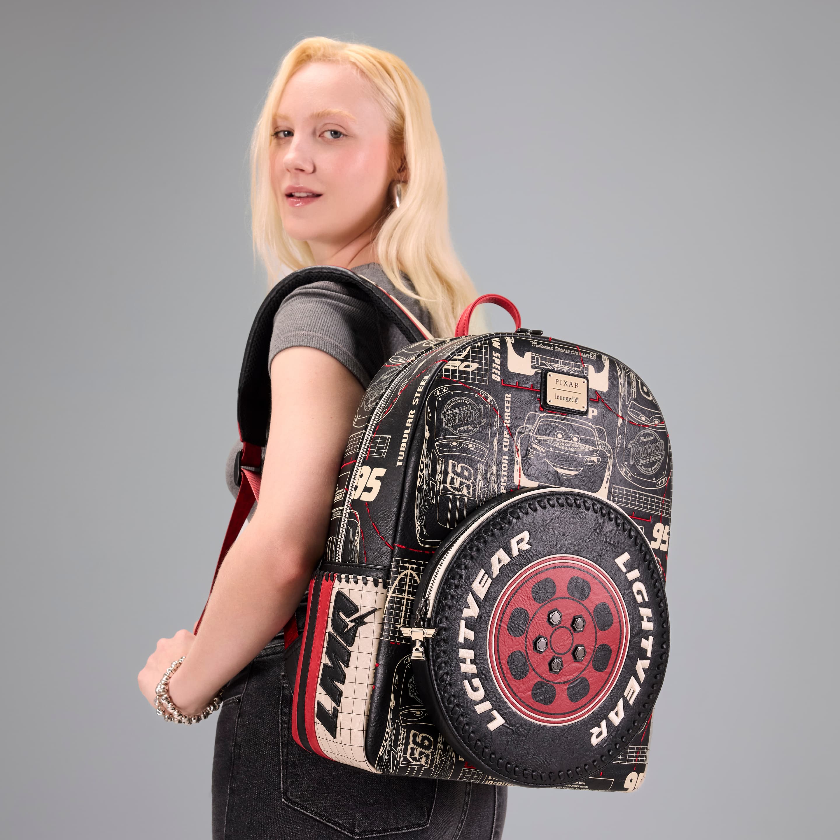 Dieser Rucksack in Originalgröße ist mit verschiedenen Motiven der Cars-Figuren in Weiß auf schwarzem Hintergrund bedruckt. Die Fronttasche hat die Form eines Reifens, auf dessen Seite „Lightyear“ steht, und in der Mitte befinden sich geformte Metallnieten! Die Träger sind halb weiß, halb rot und mit einer Applikation der Zahl „95“ verziert.