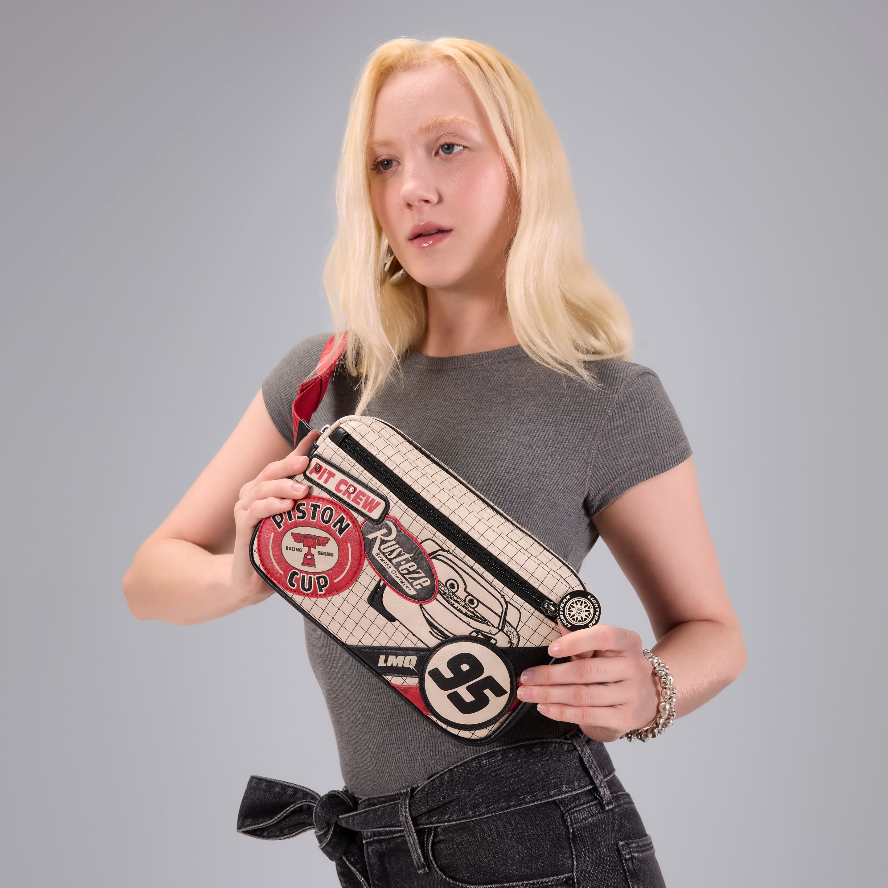 Diese Umhängetasche besteht aus verwittertem Kunstleder, geformten Metallnieten und gestickten Details, die wie Aufkleber auf der Vorderseite aussehen. Sie finden „Aufkleber” mit den Aufschriften „Pit Crew”, „Rust-eze”, „Piston Cup” und mehr! Diese Tasche ist ein wirklich lustiges Accessoire, das sowohl stilvoll ist als auch eine großartige Möglichkeit bietet, einen Ihrer Lieblingsfilme zu feiern!