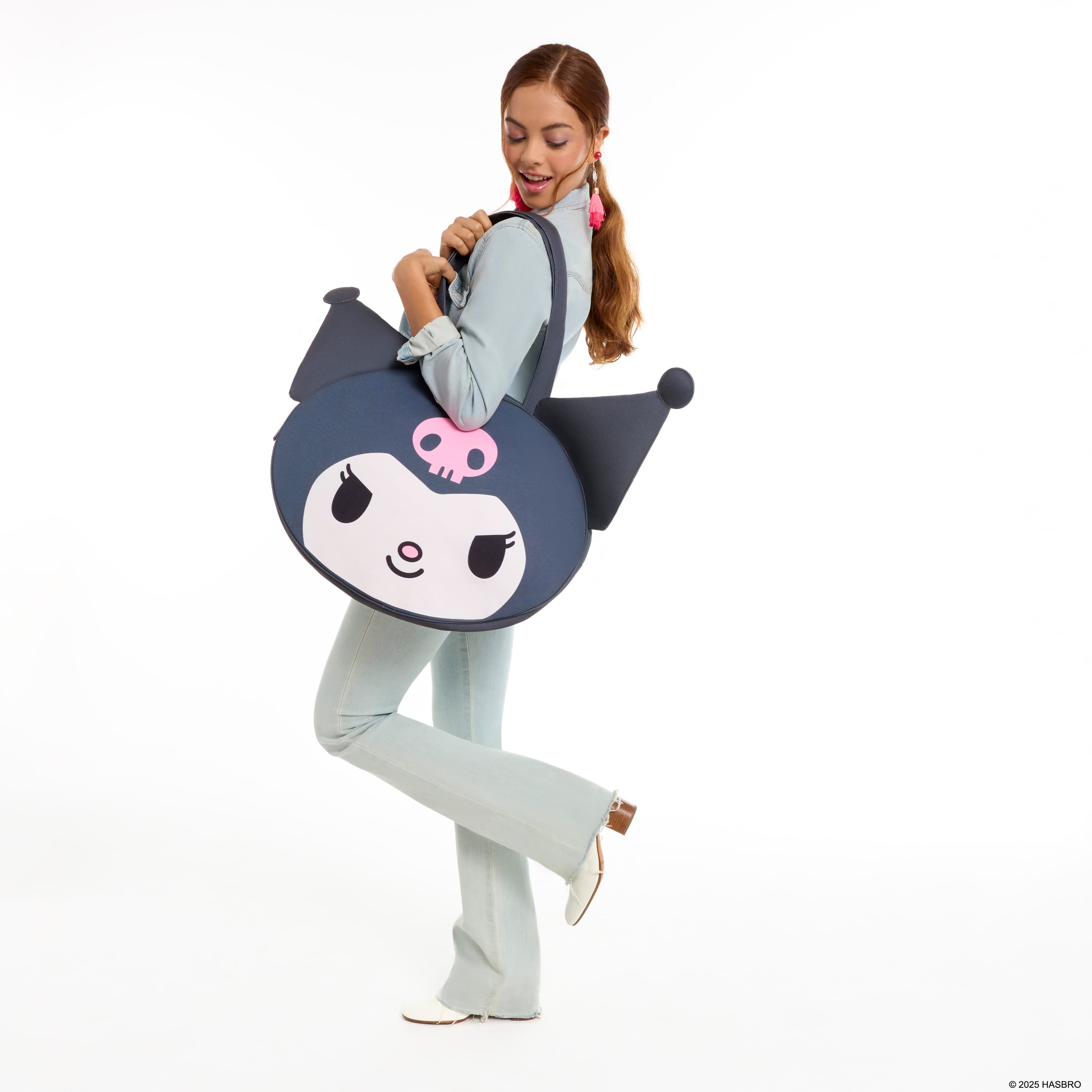 Sie hat die Form von Kuromis Kopf und ist mit ihrem Totenkopfhut verziert. Drehen Sie sie um, und Sie sehen auf der Rückseite den Schriftzug „Kuromi“ sowie ein weiteres Bild von Kuromi, die auf dem „K“ sitzt und zwinkert. Mit dieser Tasche setzen Sie zu jedem Outfit ein Statement!