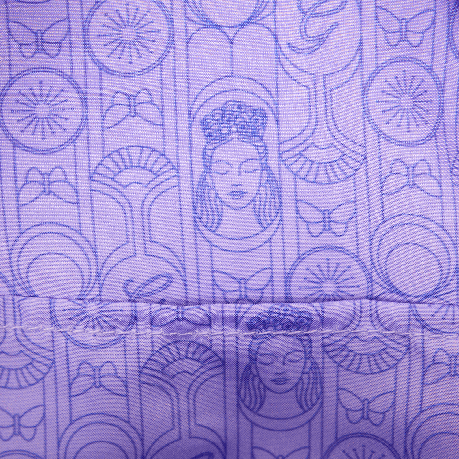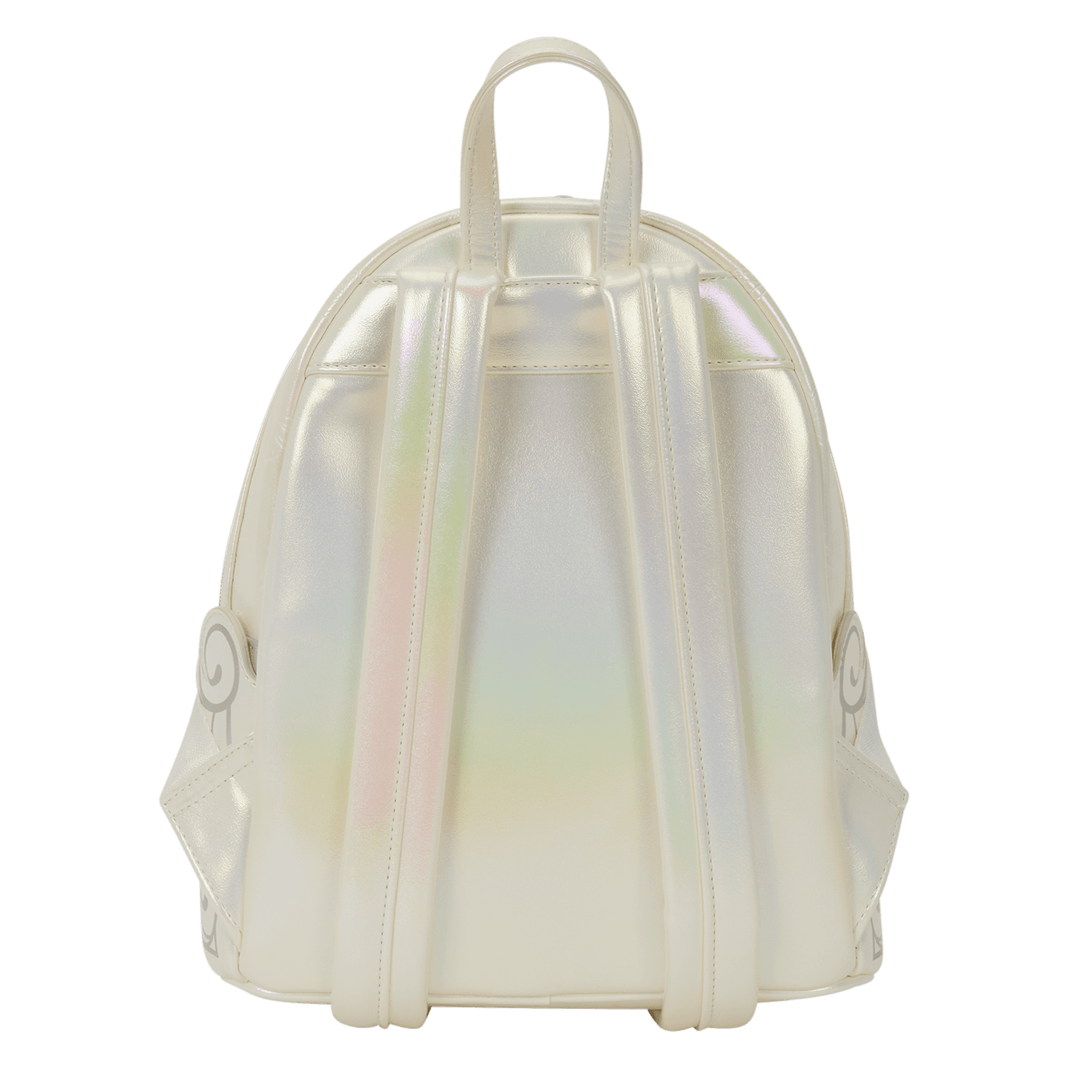 Dieser wunderschöne Mini-Rucksack besteht aus perlmuttfarbenem Kunstleder mit eleganten Details wie Silberfolie, Strasssteinen und erhabener Stickerei in passenden Farbtönen. Über der Fronttasche befindet sich eine durchsichtige PVC-Blase mit Glinda darin! Schmetterlinge und wirbelnde Muster bedecken die Tasche.