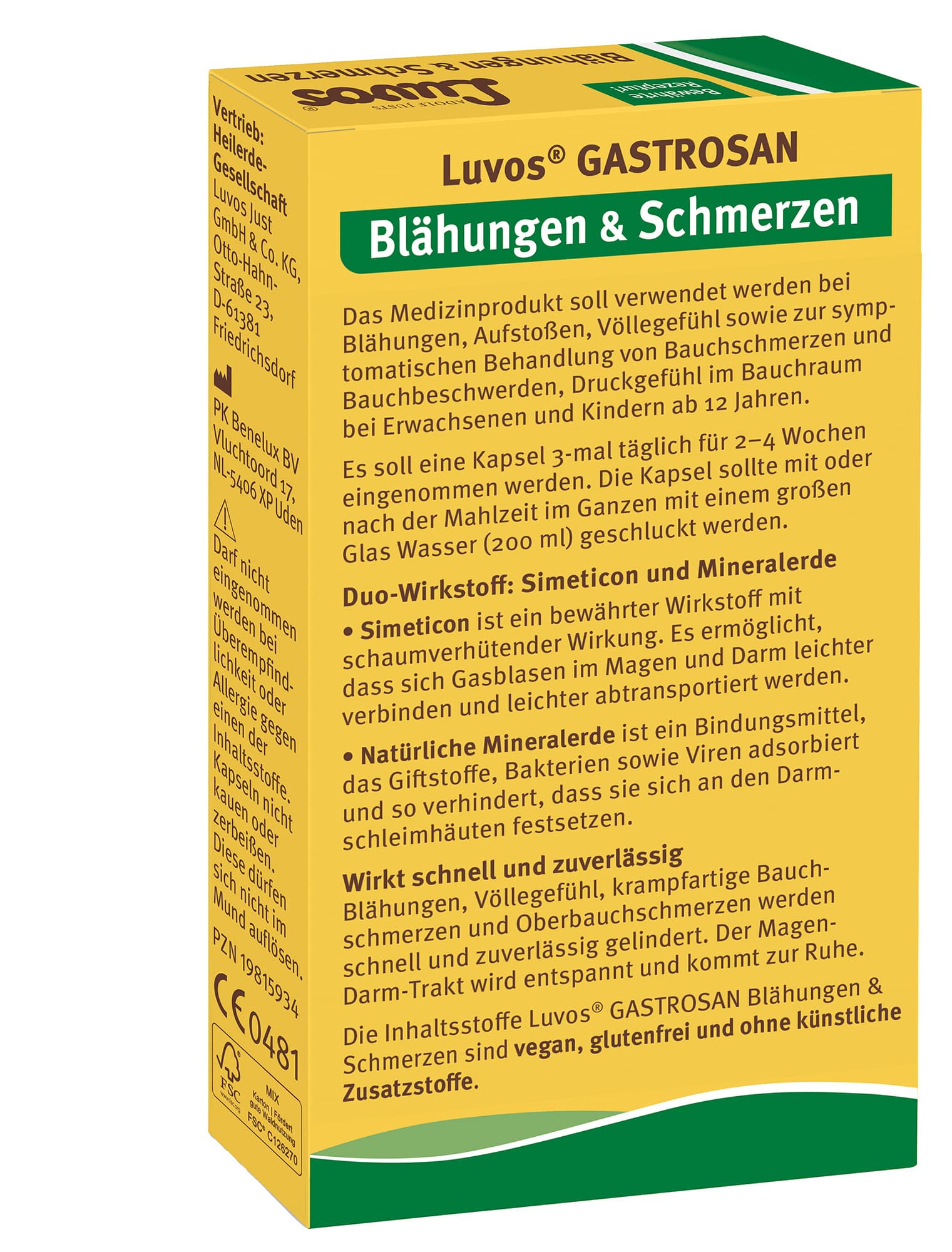Das neue Luvos-Gastrosan Blähungen & Schmerzen lindert Blähungen, Völlegefühl, krampfartige Bauchschmerzen und Oberbauchbeschwerden. Es ist vegan, glutenfrei und enthält keine künstlichen Zusatzstoffe. Mit der Kombination aus natürlicher Mineralerde und dem Wirkstoff Simeticon hilft Luvos-Gastrosan gezielt bei Blähungen: Simeticon löst Gasblasen im Verdauungstrakt auf, die natürliche Mineralerde bindet Schadstoffe und Krankheitserreger. Die Wirkstoffe werden nicht vom Darm aufgenommen, wodurch das Produkt gut verträglich ist.