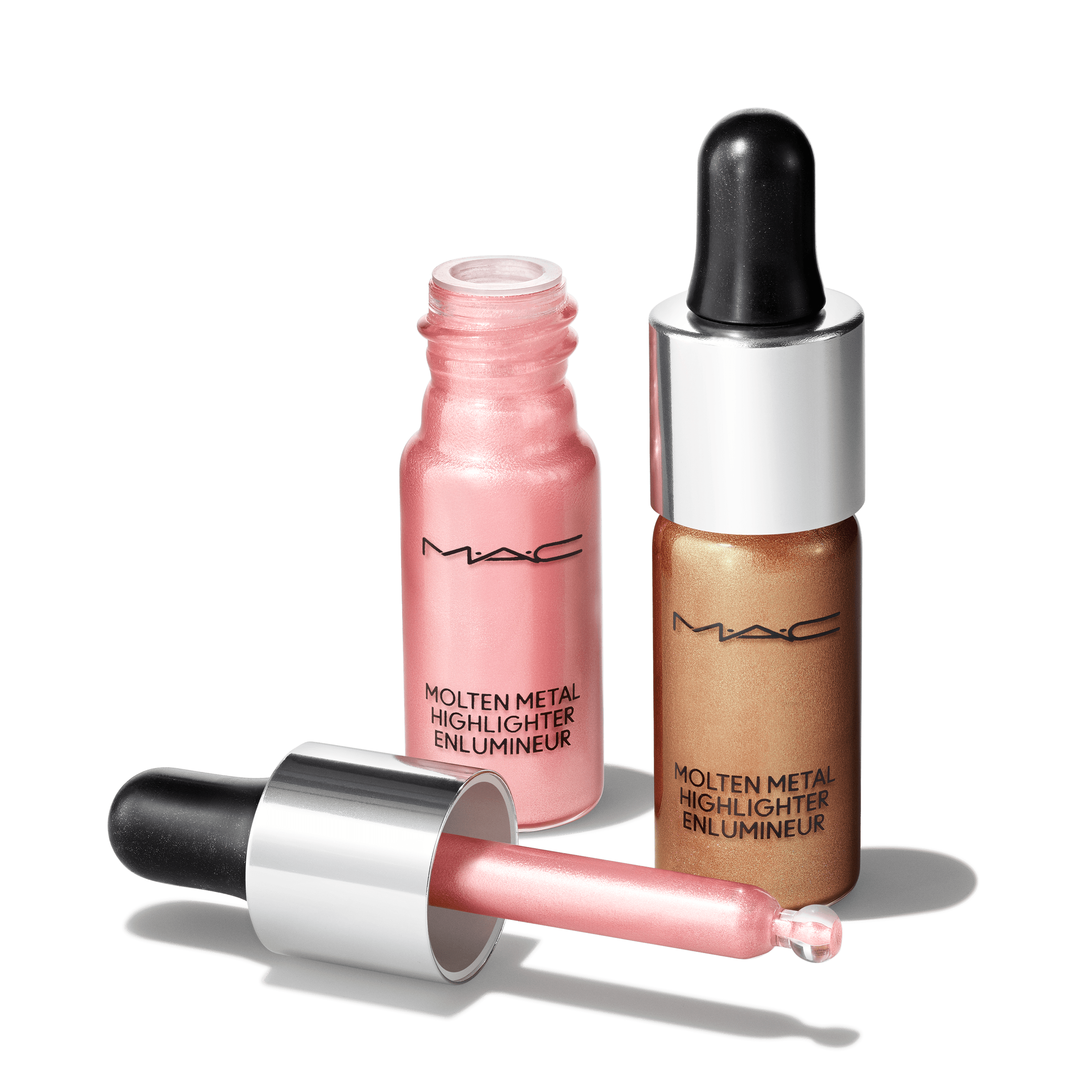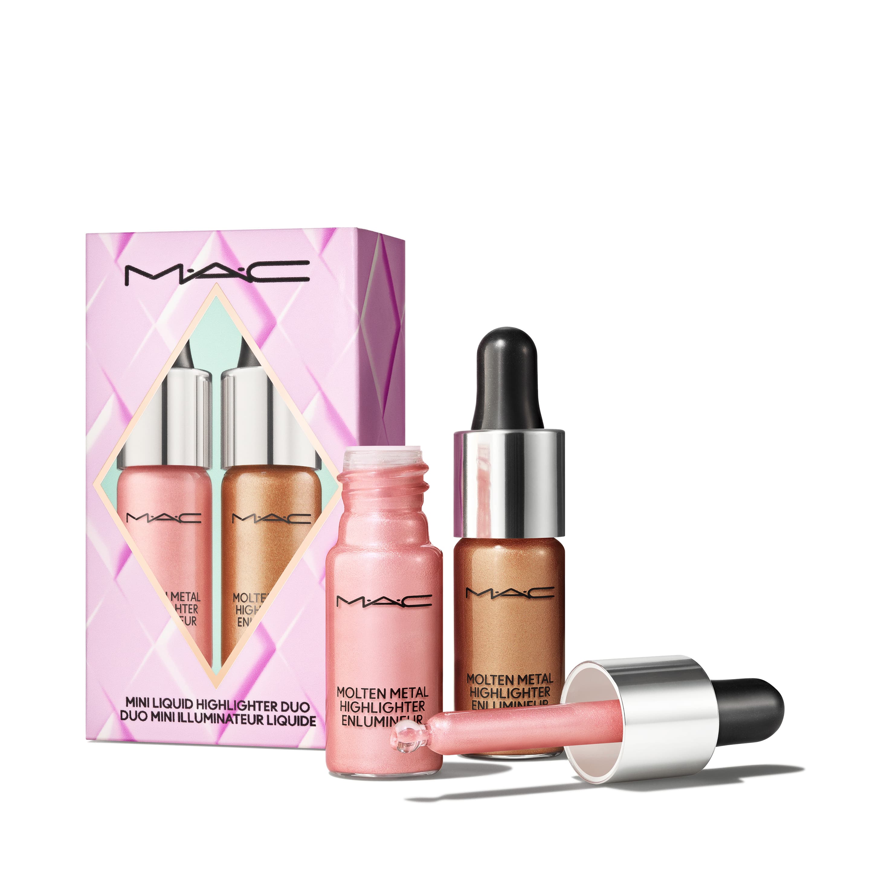Exklusives Liquid Highlighter Holiday-Set. Für die Freundin, die es liebt, sich zu schmücken... Dieses Set in limitierter Auflage enthält zwei brandneue Farbtöne des Molten Metal Highlighter in schimmerndem Rosa und Bronzegold. Diese flüssigen Tropfen mit chromfarbenen Perlglanzpartikeln können allein für einen strahlenden, spiegelartigen Glanz aufgetragen oder mit Foundation oder Feuchtigkeitscreme gemischt werden, um ein schillerndes Finish zu erzielen. Bereit zum Verschenken in einer exklusiven Weihnachtsverpackung zu einem M·A·Cnificent-Preis.