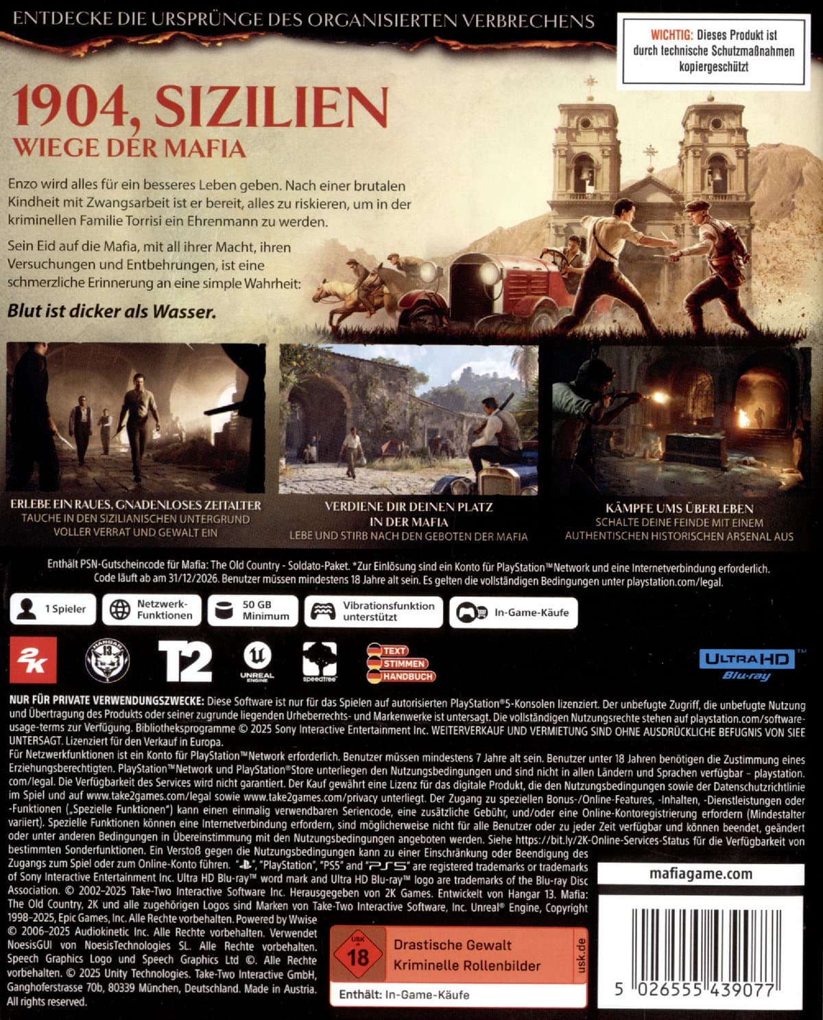 1904, SIZIELIEN - WIEGE DER MAFIA Entdecke den Ursprung des organisierten Verbrechens in Mafia: The Old Country, einer düsteren Mafia-Geschichte, die in der brutalen Unterwelt von Sizilien um 1900 spielt. Kämpfe in diesem immersiven Third-Person-Action-Adventure als Enzo Favara ums Überleben und bewähre dich bei der Cosa Nostra in einer gefährlichen und gnadenlosen Epoche. Enzo wird alles für ein besseres Leben geben. Nach einer brutalen Kindheit mit Zwangsarbeit ist er bereit, alles zu riskieren, um in der kriminellen Familie Torrisi ein Ehrenmann zu werden. Sein Eid auf die Cosa Nostra, mit all ihrer Macht, ihren Versuchungen und Entbehrungen, ist eine schmerzliche Erinnerung an eine simple Wahrheit: Blut ist dicker als Wasser. Zum Leben erwecken diese spannende Erzählung eine atemberaubende Grafik, filmreifes Storytelling und der authentische Realismus, für den die von der Kritik gelobte Mafia-Reihe bekannt ist. Enzos Geschichte trägt sich in einer Zeit zu, in der die Virtuosität mit dem Stilett oft noch tödliche Folgen haben konnte, die Schusswaffe der Wahl häufig die Lupara, eine abgesägte Flinte, war, mörderische Fehden Jahrzehnte andauerten und Mafiosi ihre Reviere zu Fuß, zu Pferde oder am Steuer eines Automobils der Jahrhundertwende patrouillierten. ERGRÜNDE EINE GNADENLOSE WELT DES ORGANISIERTEN VERBRECHENS Die raue Schönheit der zerklüfteten sizilianischen Landschaft ist der krasse Gegensatz zu den finsteren Gassen der Stadt – aber Verrat und Gewalt lauern auch hier an jeder Ecke. Rivalisierende Familien und ihre rücksichtslosen Bosse führen, verborgen vor den Augen der Öffentlichkeit, niemals endende Revierkämpfe. Vertrauen ist ein rares Gut und Loyalität ein Grund zu töten. SPIELE EINEN MAFIA-FILMKLASSIKER Du bist der Antiheld dieser fesselnden Story, in der du als Enzo kurz nach der Jahrhundertwende jeden Schritt deines Weges in die kriminelle Unterwelt Siziliens bestimmst. In diesem klassischen Krimi-Drama triffst du auf unberechenbare Verbündete und gnadenlose Feinde. Tauche ein in eine mediterrane Kulisse, die dich mit Liebe zum Detail in eine verräterische Zeit entführt. KÄMPFE UMS ÜBERLEBEN Behaupte dich, wenn es um Leben oder Tod geht, im Nahkampf mit der Klinge oder aus der Entfernung mit verschiedenen Schusswaffen. Überfalle deine Feinde mit Heimlich-Kills oder töte sie im Nahkampf. Wenn du lieber schießt, ballere mit historischen Pistolen, Gewehren und Schrotflinten, um Hindernisse und vor allem die Feinde des Dons aus dem Weg zu räumen. BEWEGE DICH AUTHENTISCH UND STILVOLL FORT Erkunde die Vielfalt Siziliens – von unterirdischen Krypten und bröckelnden Ruinen zu üppigen Weinbergen und reich verzierten Opernhäusern. Ob du deiner nächsten Zielperson einen Besuch abstatten willst oder schleunigst die Flucht ergreifen musst, zu Ross übers Kopfsteinpflaster und weite Felder galoppierst oder auf Schotterpisten in einem Automobil der Jahrhundertwende fährst, du bist immer mit Klasse unterwegs. Texte, Stimmen und Handbuch auf Deutsch