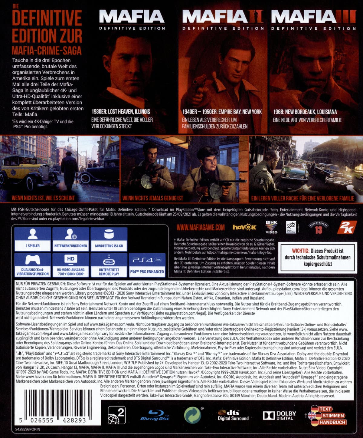 Mafia II: Definitive Edition – eine liebevoll überarbeitete Version des Fanlieblings von 2010 mit stark verbesserter Grafik und rundüberholtem Sound und Mafia III: Definitive Edition enthalten sämtliche Story-Erweiterungen sowie eine Reihe anderer Bonusgegenstände. Besitzer von Mafia III auf PlayStation 4 erhalten ein Upgrade auf Mafia III: Definitive Edition ohne zusätzliche Kosten.