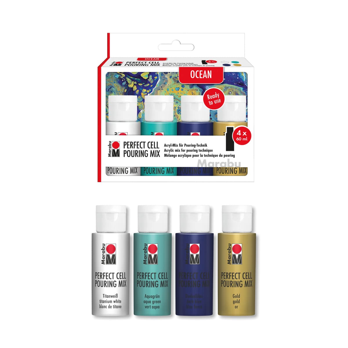 Im Set enthalten: 4 x 60 ml Pouring Mix (Titanweiß, Aquagrün, Dunkelblau, Gold)