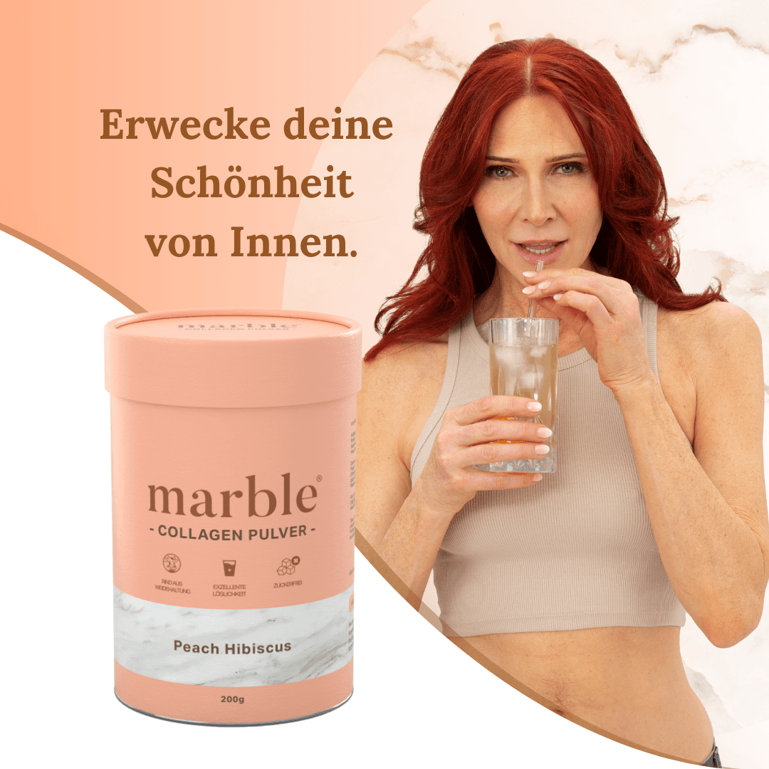 Marble Collagen Pulver kombiniert hochwertige Kollagenpeptide mit einem fruchtig-blumigen Geschmack aus Pfirsich und Hibiskus. Einfach zu dosieren, vielseitig anwendbar und perfekt geeignet für die tägliche Routine.