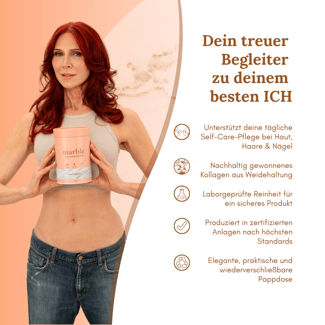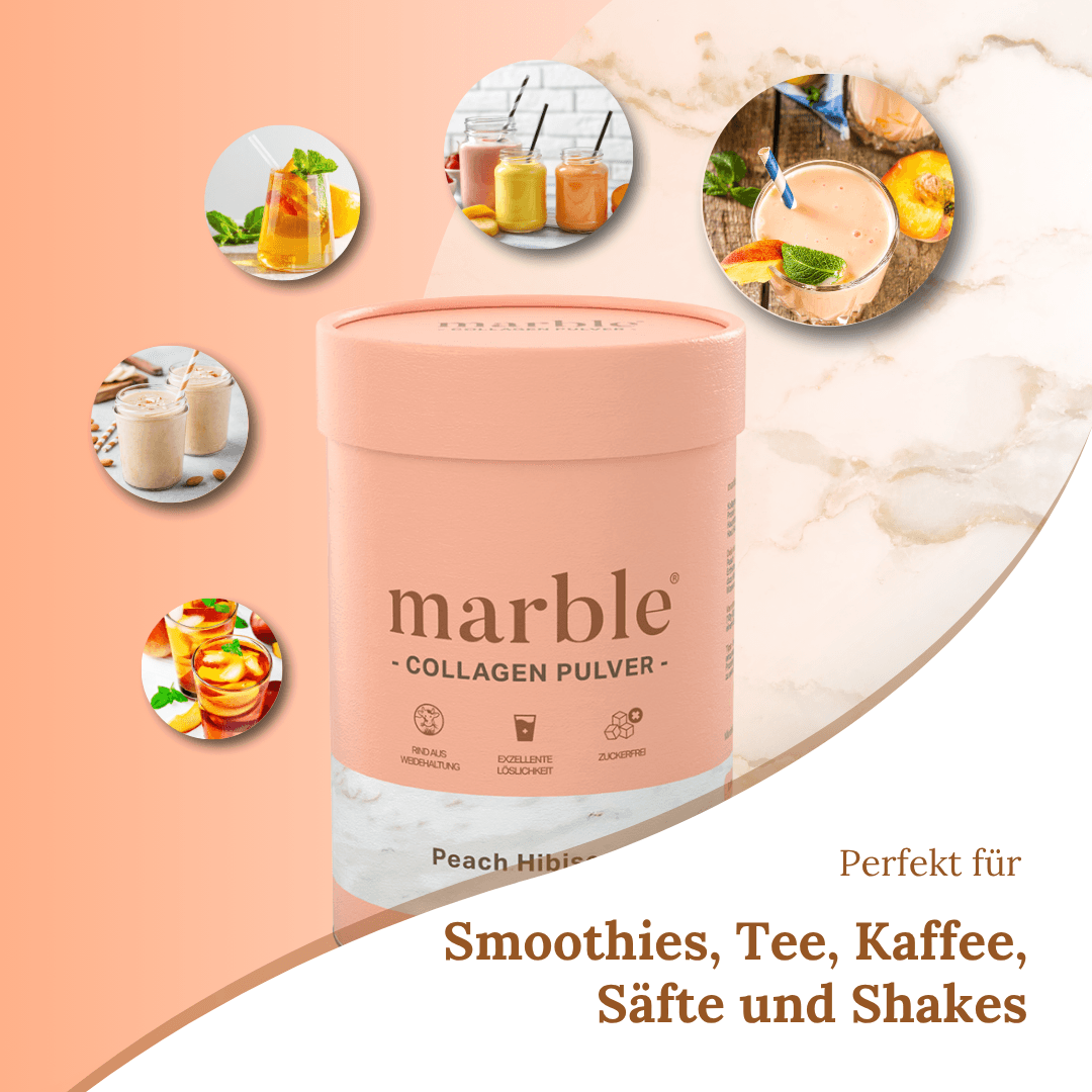Ob in Wasser, Smoothies oder Joghurt – marble Collagen Pulver Peach Hibiscus ist eine unkomplizierte Ergänzung für den Alltag.