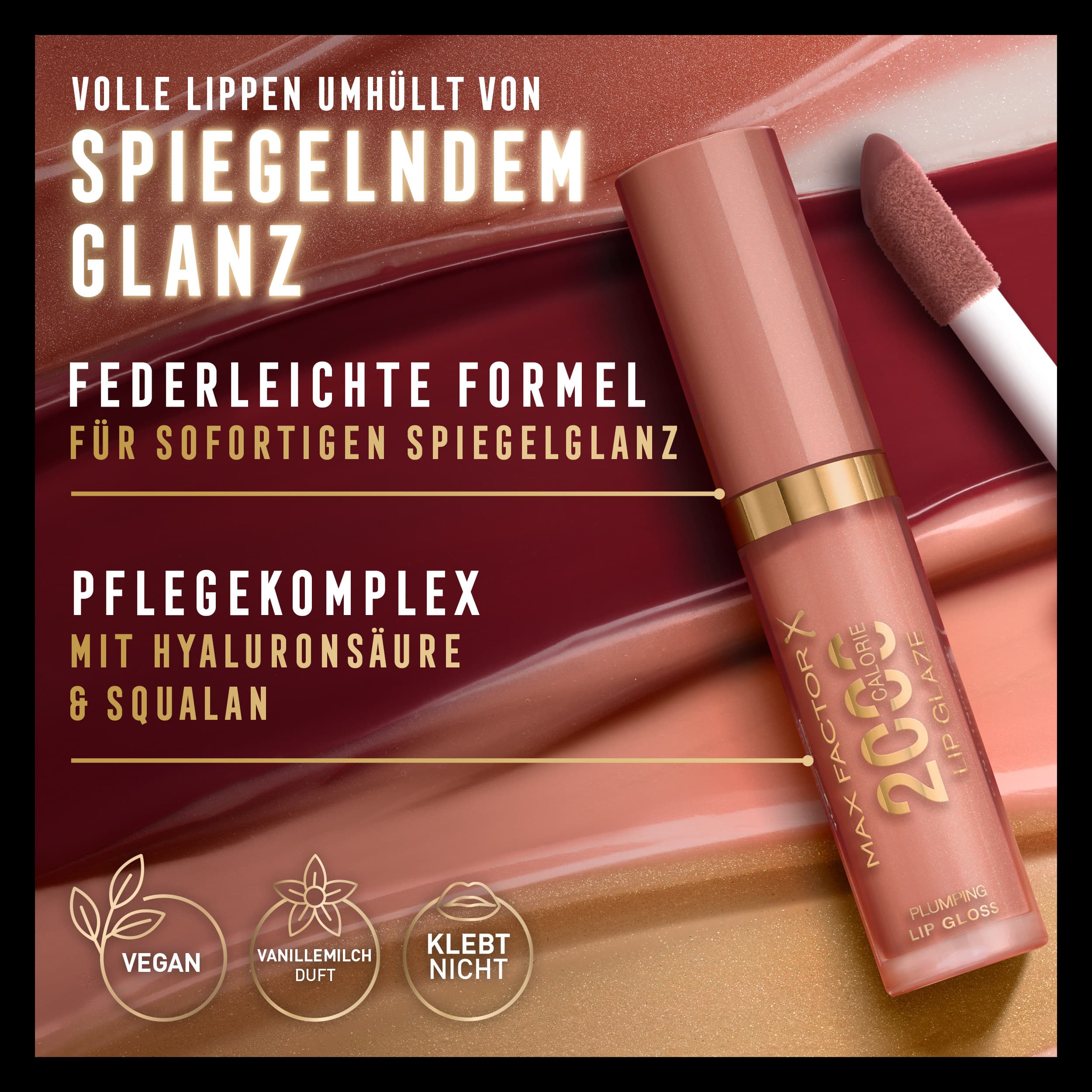 Der 2000 Calorie Lip Glaze von Max Factor zaubert einen ultraglossy Lippenlook mit Volumen-Effekt. Gleichzeitig versorgt er die Lippen dank seiner reichhaltiger Pflegeformel mit Hyaluron und Squalan. Einzeln aufgetragen polstert er die Lippen optisch auf und sorgt für sichtbar mehr Volumen, das für Stunden anhält.Über einem farbigen Lippenstift erzielt der Lipgloss ein noch intensiveres Farbergebnis. Dank des extragroßen, weichen Applikators lässt er sich sanft und einfach mit nur einer Anwendung auftragen. Die leichte cleane und vegane Formel klebt nicht und bietet einen maximalem Komfort auf den Lippen. Der 2000 Calorie Lip Glaze ist in 6 bezaubernden Farbnuancen mit schimmerndem, cremigem und transparentem Finish erhältlich und zeichnet sich zudem durch seinen verführerischen, süßlichen Duft von Vanillemilch aus.
