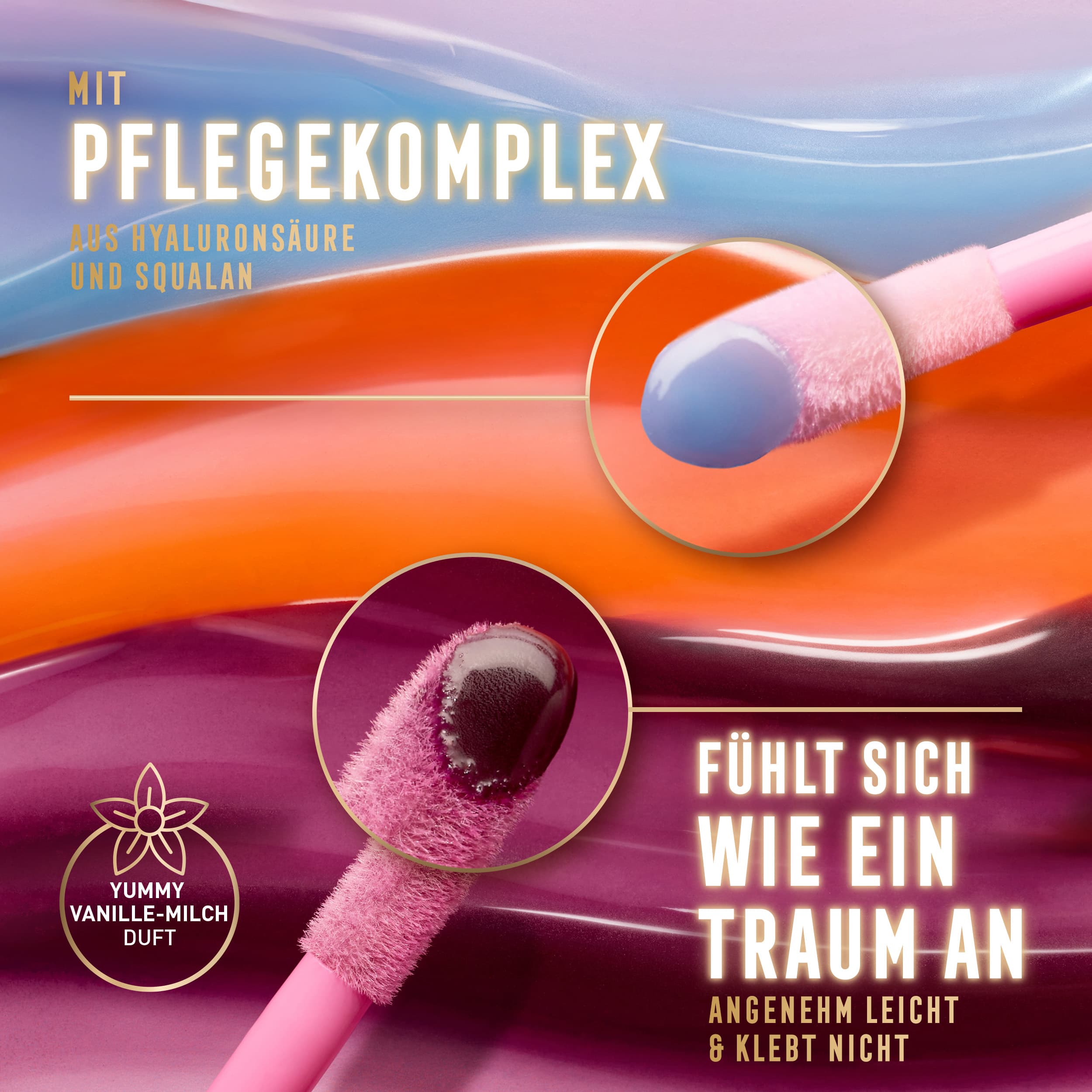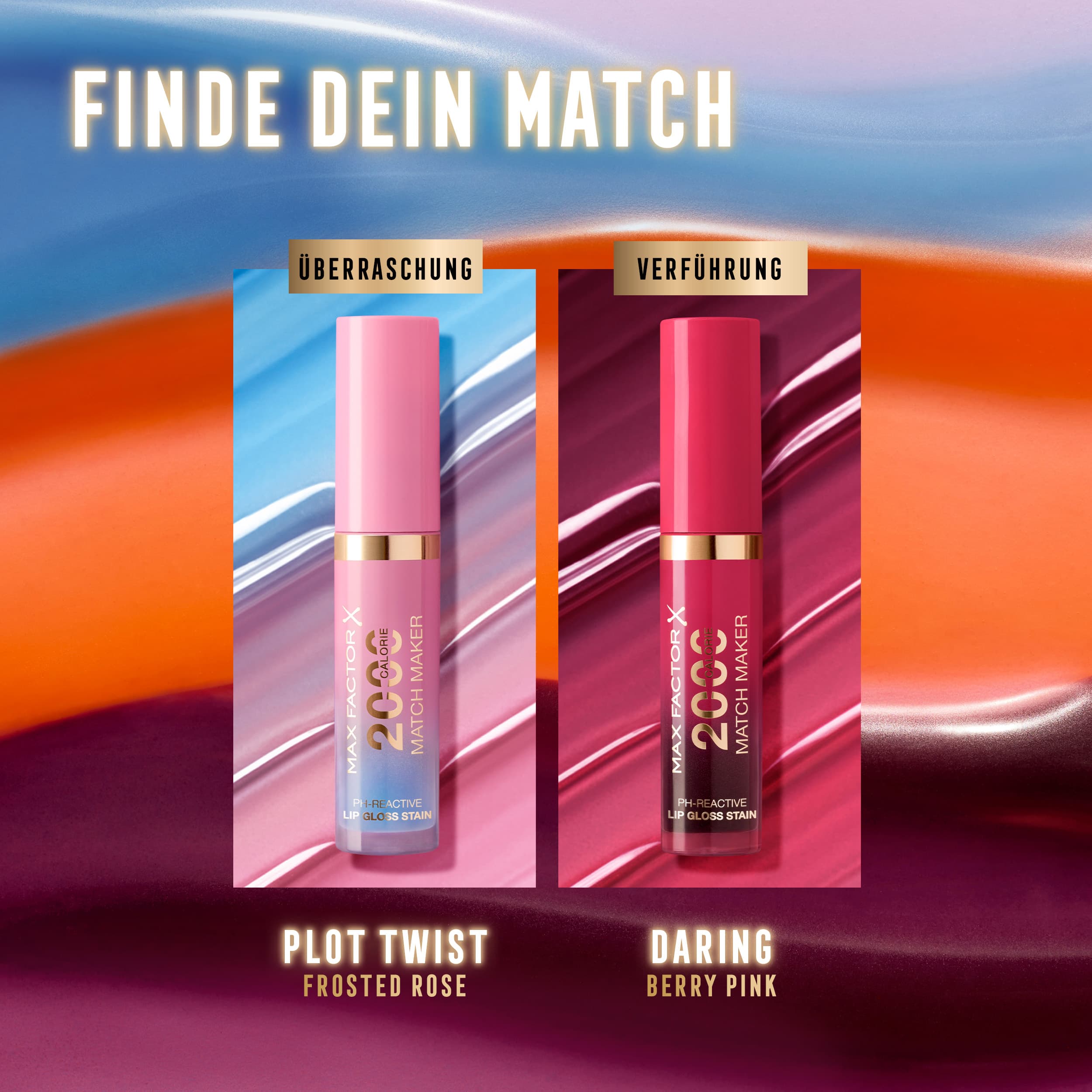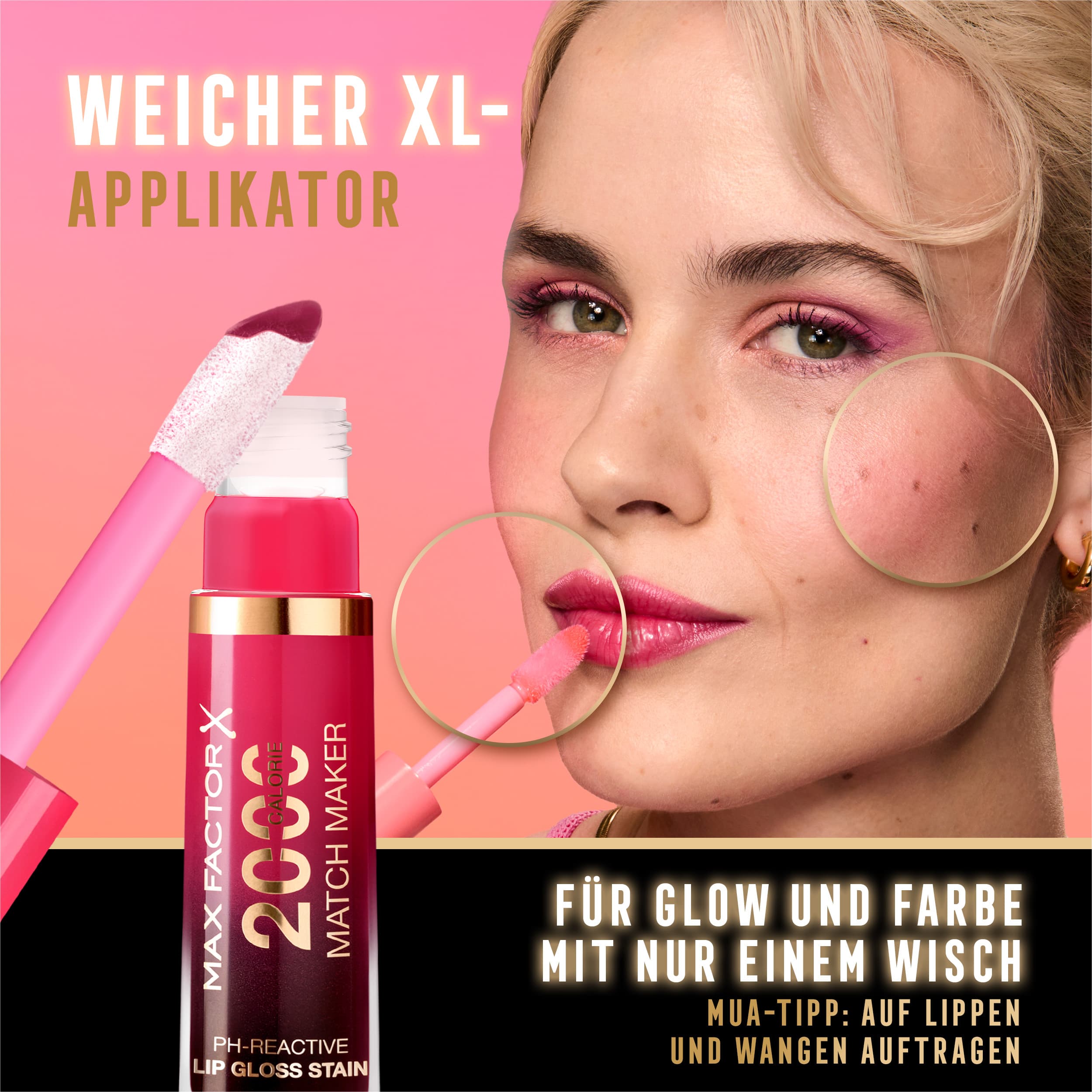 All about lip chemistry: Der Max Factor 2000 Calorie Match Maker entfaltet seine Magie durch die pH-reaktiver Formel, welche die perfekte, individuelle Farbe mit Glanz und Stain-Effekt verleiht. Der langanhaltende, feuchtigkeitsspendende Lipgloss ist mit einem Pflegekomplex aus Hyaluronsäure und Squalan angereichert, der sich traumhaft leicht und kein bisschen klebrig anfühlt. Abgerundet wird das Erlebnis durch einen yummy Vanillemilch-Duft, den man den ganzen Tag über genießen möchte. Der XL-Applikator macht das Auftragen zum Kinderspiel und verleiht Stain und Glanz in nur einem Zug – auf Lippen oder Wangen. Der Max Factor 2000 Calorie Match Maker lässt seine Magie in zwei unwiderstehlichen Farbnuancen wirken.