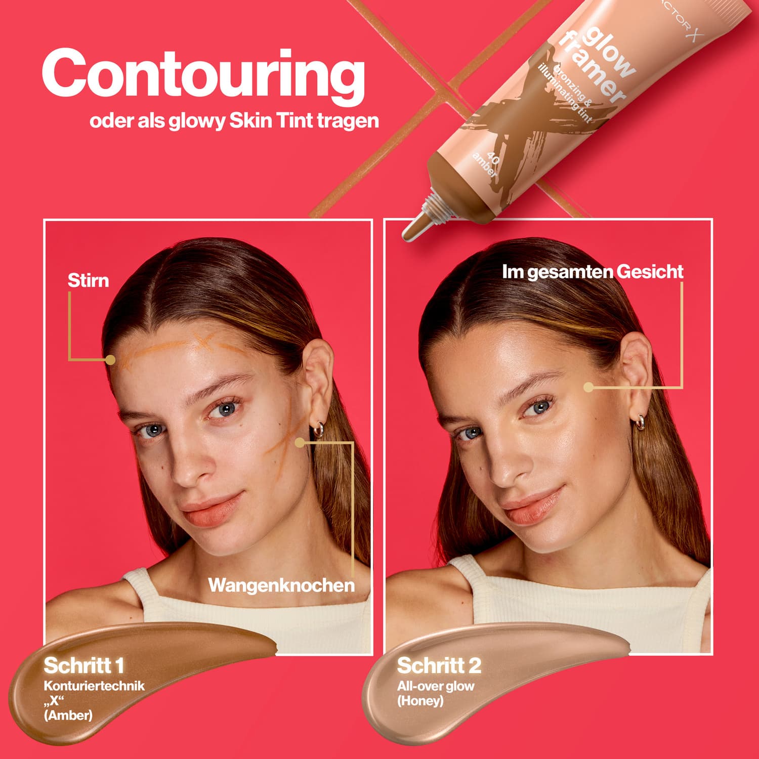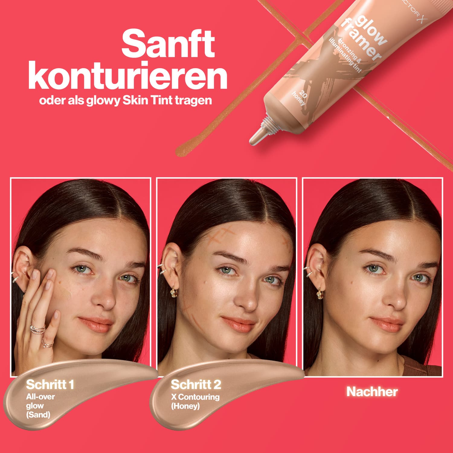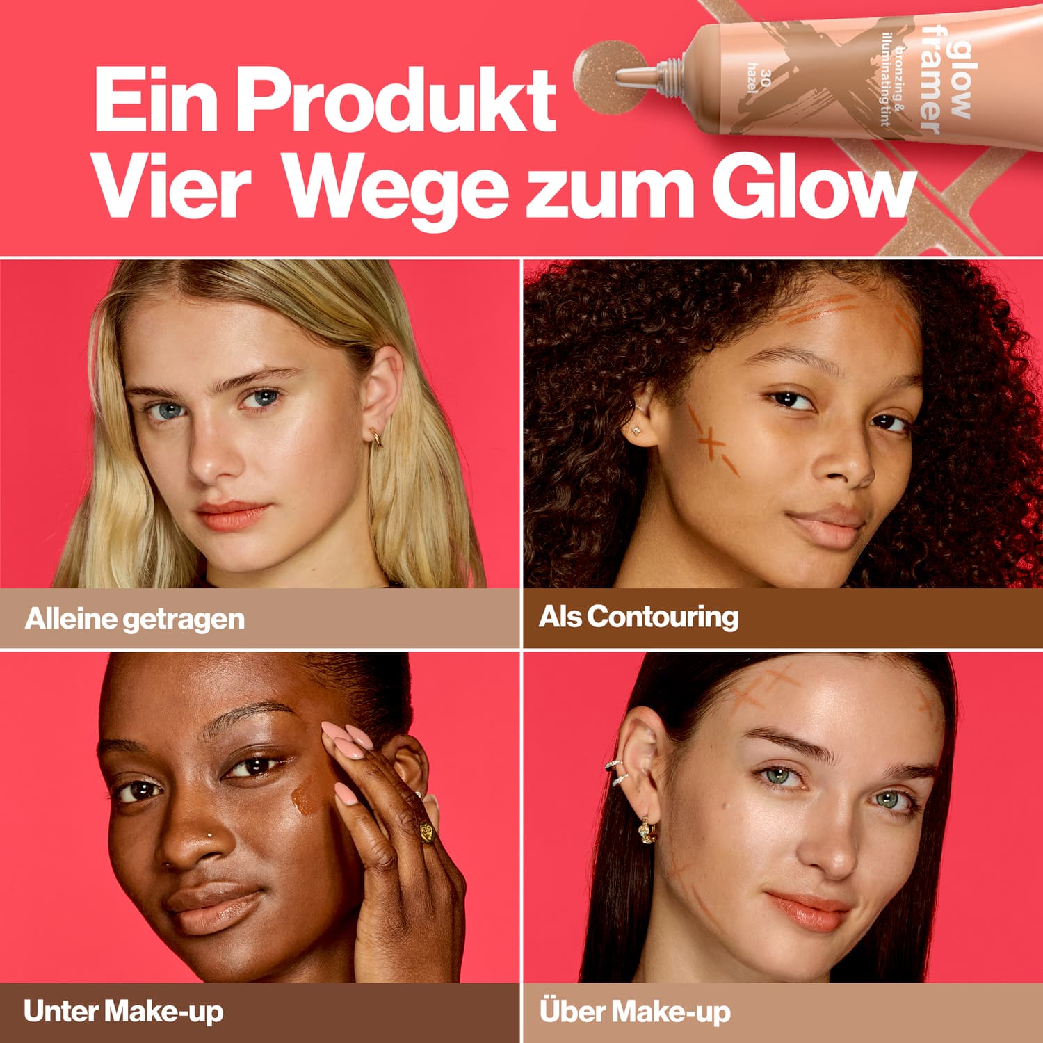 | Anwendungshinweis | Step 1: Den Glow Framer entweder großflächig auftragen… Step 2: … oder für das Contouring auf die hervorgehobenen Stellen des Gesichts geben, um die natürlichen Gesichtszüge zu betonen. Step 3: Mit den Fingern oder einem Pinsel gleichmäßig verblenden. |