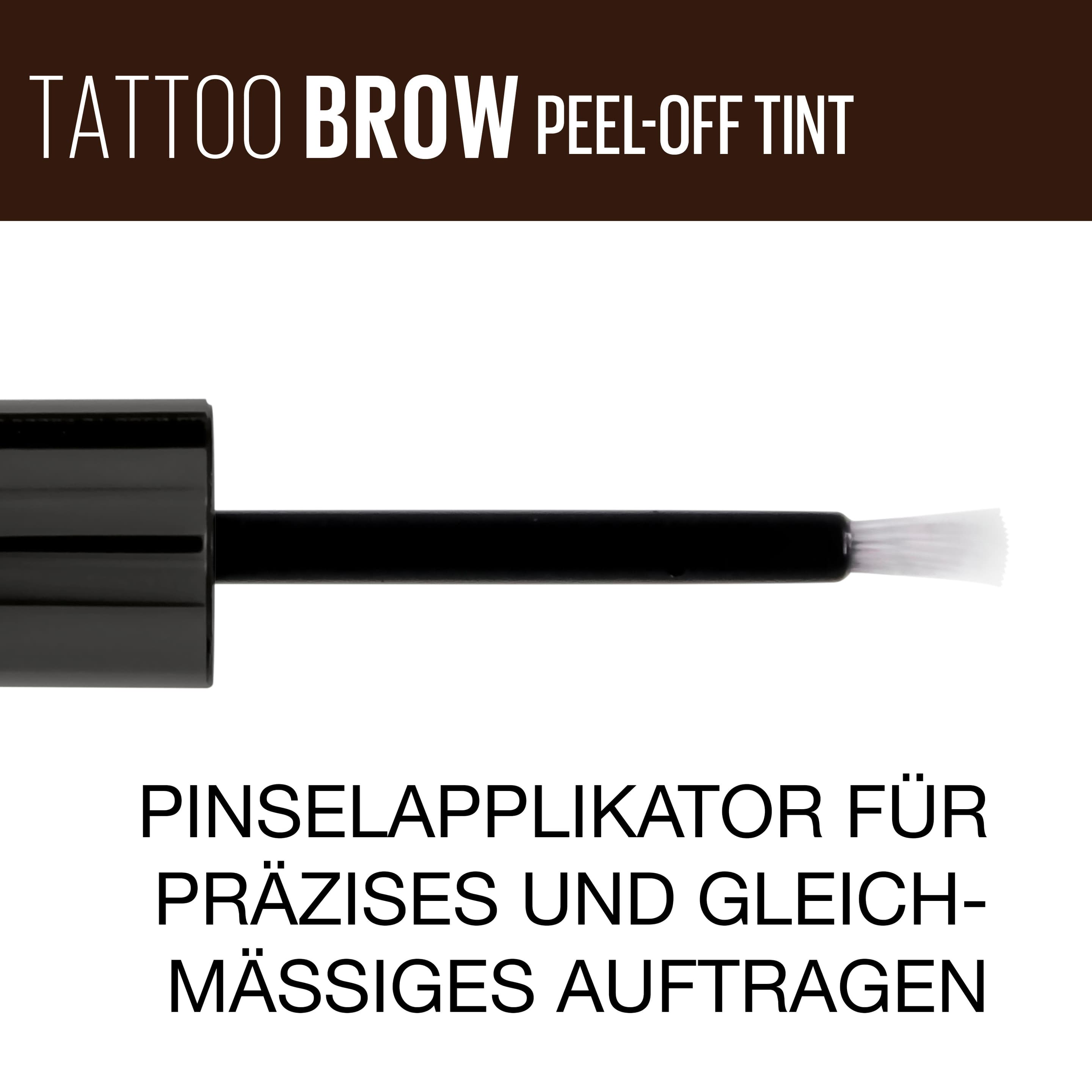 AnwendungshinweisMit der innovativen Maybelline Tattoo Brow Augenbrauenfarbe gelingen schöne Augenbrauen in nur 3 einfachen Schritten: Zunächst das Gel mit dem Pinsel-Applikator präzise auf die Augenbrauen auftragen. Mindestens 20 Minuten trocknen lassen. Anschließend die Textur von einem Brauenende sanft abpeelen. Perfekte Augenbrauen – schonend, schnell und sauber! Tipp: Für ein Ergebnis, das bis zu 3 Tagen anhält, das Gel vor dem Peelen 2 Stunden trocknen lassen. Keine Zeit? Die Maybelline Tattoo Brow Augenbrauenfarbe über Nacht einwirken lassen und einfach am nächsten Morgen blitzschnell entfernen.
