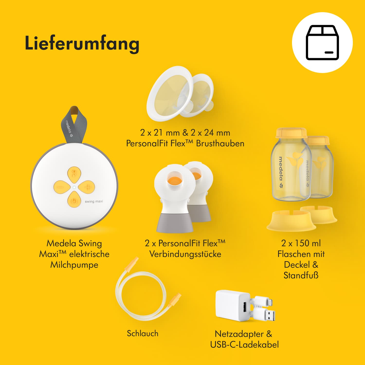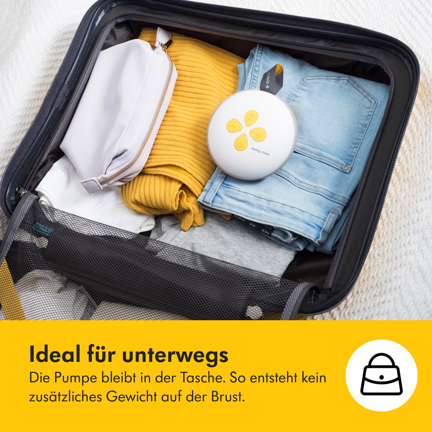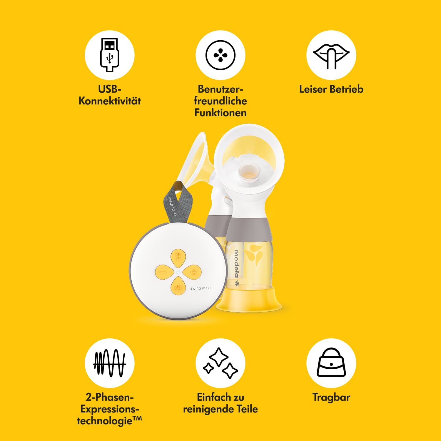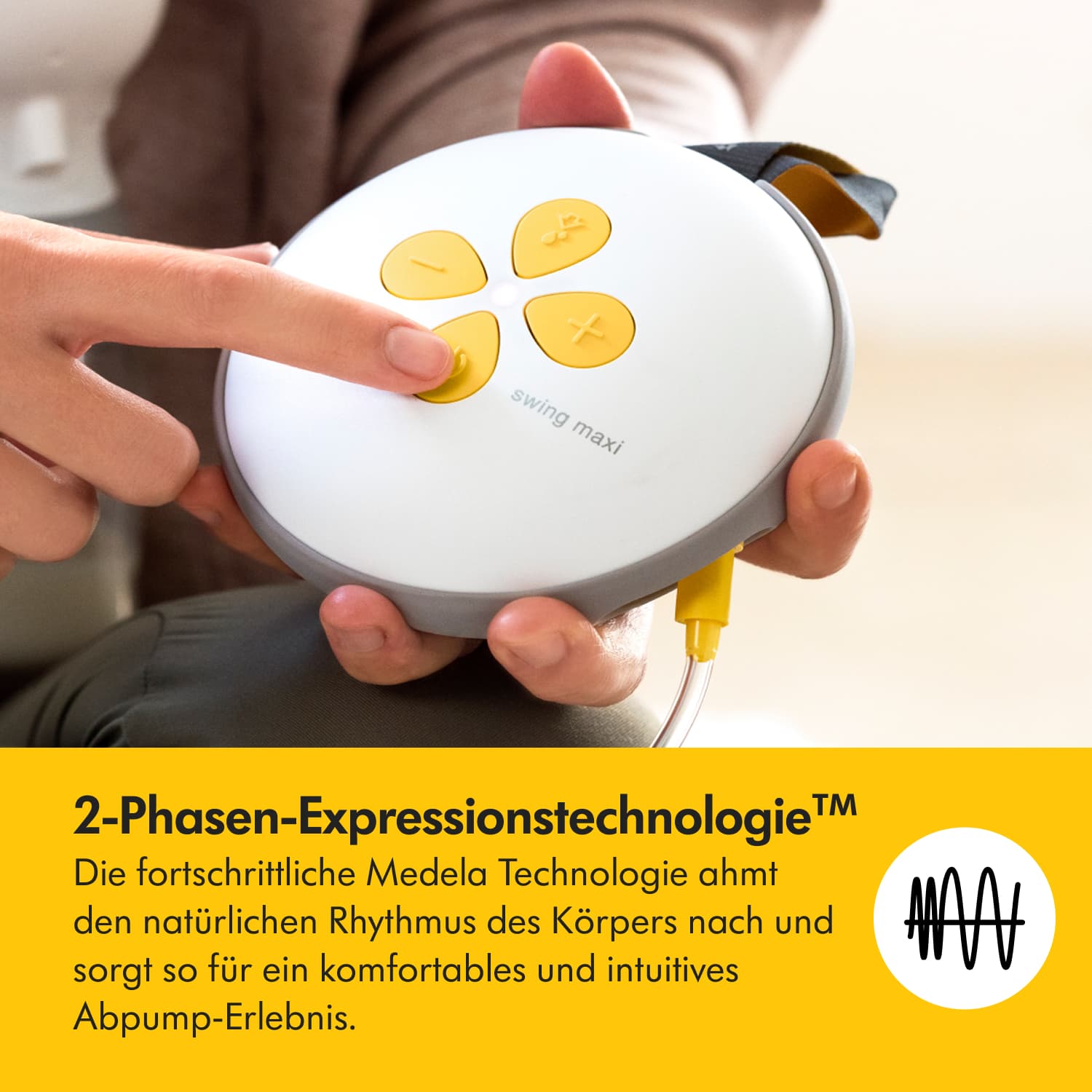 Die elektrische Milchpumpe Medela Swing Maxi TM ist eine kompakte und einfach zu bedienende elektrische Doppelmilchpumpe, die sich unkompliziert in dein Leben einfügt und noch flexibler einsetzen lässt. Praktisch für unterwegs mit 2 Phase Expression Technologie, PersonalFit Flex Brusthaube und integriertem Akku. Da sie nur aus wenigen Teilen besteht, lässt sich diese tragbare Milchpumpe von Medela leicht reinigen und zusammensetzen. Mit ihrer intuitiven Benutzeroberfläche, 4 Tasten und 9 Voreinstellungen ist sie äußerst einfach zu bedienen. Einfach abpumpen, wo du gerade bist auch wenn keine Steckdose in der Nähe ist.