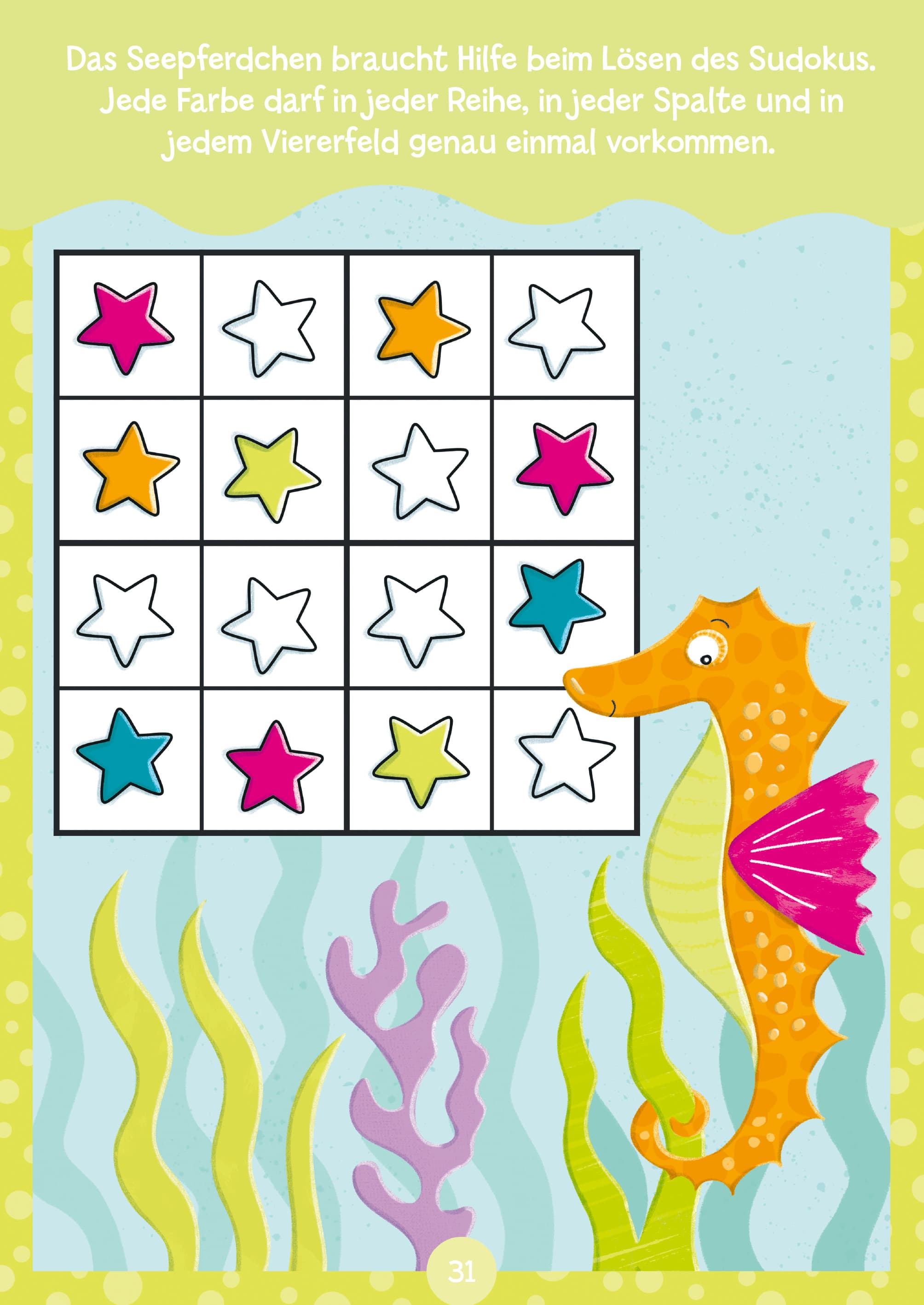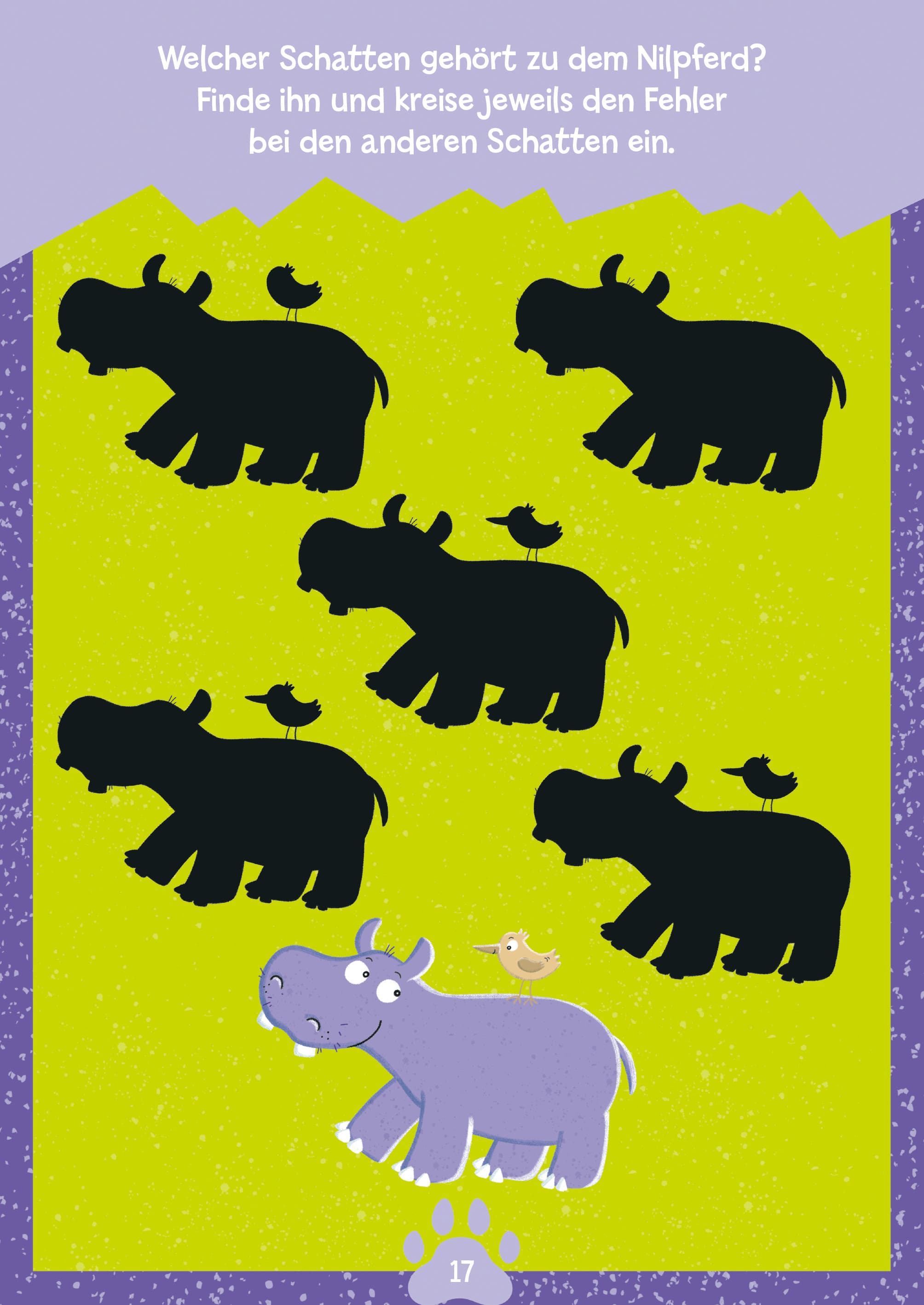 Bunt, spannend und voller Abenteuer – jetzt wird gerätselt, gemalt und gezählt! Der Rästelblock bietet 96 farbig illustrierte Seiten voller abwechslungsreicher Aufgaben. Ob Tiger, Haie, Seepferdchen oder Krokodile – kleine Tierfans entdecken eine fantasievolle Rätselwelt, die Spaß macht und zum Mitmachen einlädt. Die Kinder helfen dem Krokodil, den Weg zu seinen Eiern zu finden, entdecken Unterschiede zwischen bunten Bildern, zählen exotische Tiere oder suchen Paare von schillernden Zierfischen im Korallenriff. Neben klassischen Knobeleien wie Labyrinthen und „Finde den Fehler“ laden Mal- und Nachspurübungen auch zur kreativen Beschäftigung ein. Der Block ist ideal für Kinder ab 4 Jahren: Alle Aufgaben sind klar erklärt, abwechslungsreich gestaltet und steigern sich von leicht bis knifflig. So bleibt die Freude am Rätseln lange erhalten. Ganz nebenbei werden Konzentration, Geduld, Beobachtungsgabe und logisches Denken gefördert. Ob zuhause, unterwegs oder als Geschenk: Mit diesem Rätselmix tauchen Kinder ein in eine bunte Welt voller wilder Tiere und magischer Unterwasserabenteuer!
