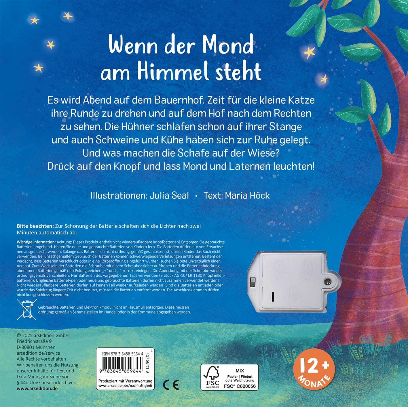 Es wird Abend auf dem Bauernhof. Leise geht der Mond am Himmel auf und im Stall gehen die Laternen an. Die kleine Katze macht sich auf den Weg und dreht ihre abendliche Runde über den friedlichen Hof, um überall nach dem Rechten zu sehen. Die Hühner schlafen schon auf ihrer Stange und auch Schweine und Kühe haben sich zur Ruhe gelegt. Nur in der Scheune toben noch die frechen Mäuse umher. Und was machen die Schafe auf der Wiese? Drück auf den Knopf und lass die Lichter leuchten!