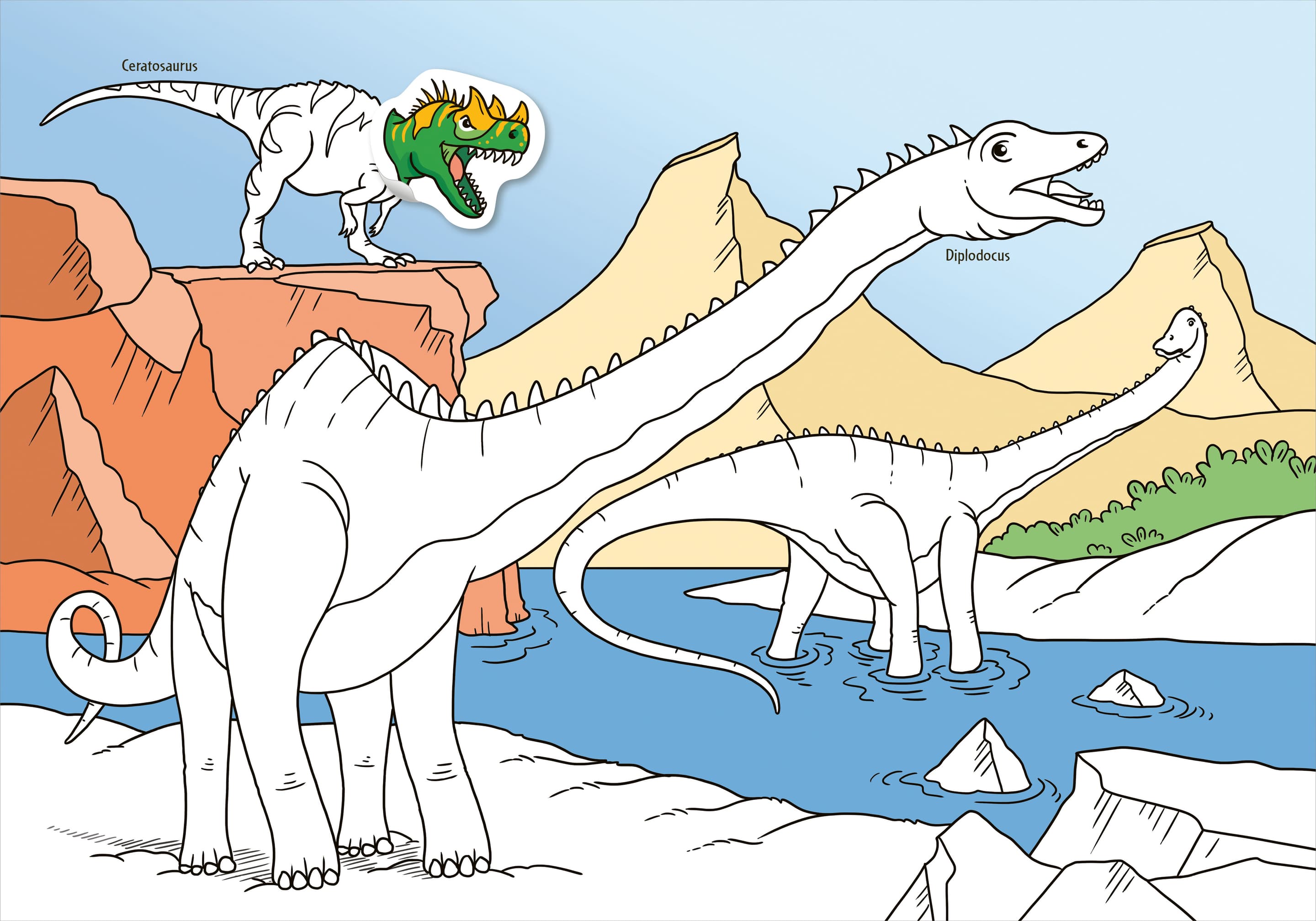 Zwei Lieblingsbeschäftigungen vereint in einem Heft: Das Sticker-Malbuch liefert bunte Sticker und schöne Szenen zum Ausmalen. Auf jeder Seite befinden sich Motive, auf die passgenaue Sticker aufgeklebt werden können. Dadurch ergeben sich abwechslungsreiche Motive aus der Welt der Dinos. Die lebendigen Szenen zeigen die Lieblingstiere der Kinder beim Fressen, Jagen oder Ausruhen. Viel Sticker- und Malspaß ab 5 Jahren.