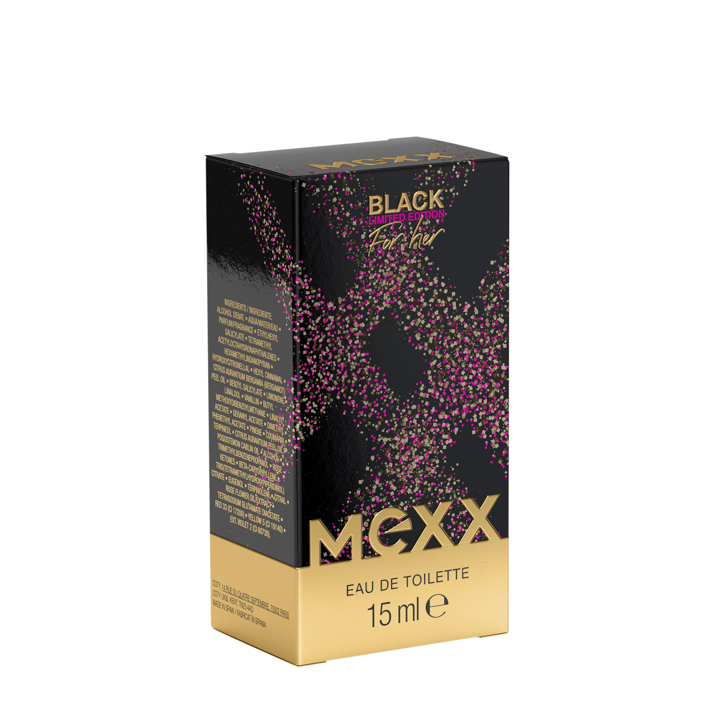 | Anwendungshinweis | Um die Intensität des Dufts zu erhöhen, das MEXX Black Limited Edition Eau de Toilette für Frauen auf die Pulspunkte am Körper sprühen: Hals, Dekolleté, Handgelenke und Knöchel. |