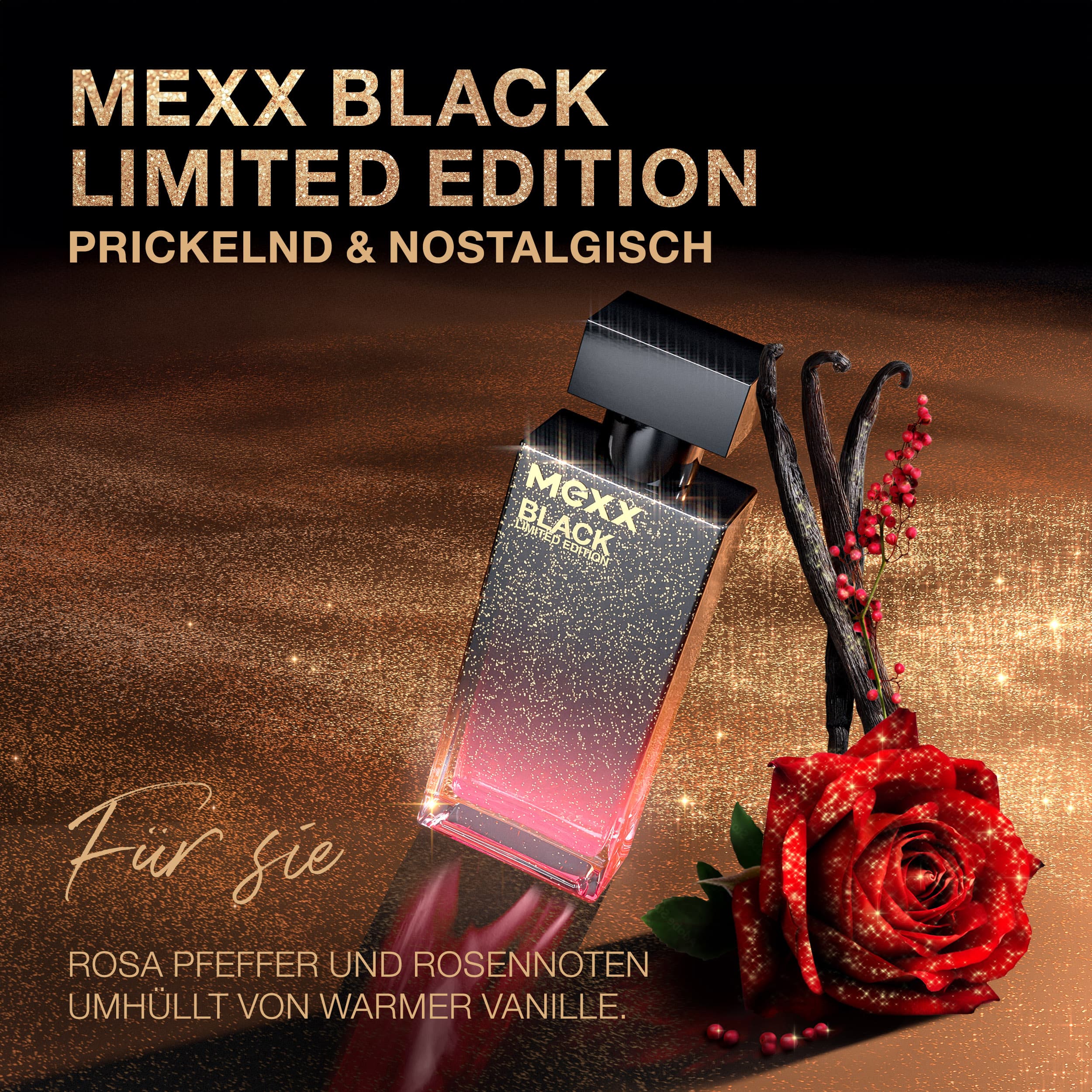 Erinnere dich an dein erstes Date, deinen ersten Kuss, deinen ersten Duft. Das neue MEXX Black Limited Edition Eau de Toilette für Frauen fängt mit seinem prickelnden Duft das aufregende Gefühl ein, etwas zum ersten Mal zu erleben. Momente voller Aufregung, Begeisterung und Glück – wie beim ersten Kuss. Der unwiderstehlich feminine Duft eröffnet mit würzig-spritzigen Noten aus rosa Pfeffer, Bitterorange und Mandarine. Darauf folgt ein zartes blumiges Herz aus Rose, Magnolie und Maiglöckchen, das durch frisches Apfelöl unterstrichen wird. Abgerundet wird das Dufterlebnis durch eine warme, cremige Basis aus Vanilleakkord, Tonka und Patschuli. Der limitierte Winterduft befindet sich im elegant schwarzen Glasflakon, der mit goldfarbenen Akzenten versehen ist – ideal als Geschenk für sich selbst oder einen geliebten Menschen.
