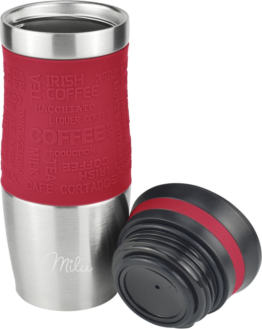 Mit dem Isolierbecher-Set von MILU lassen sich Heiß- und Kaltgetränke auch unterwegs stilvoll genießen. Der Becher mit 370 ml Fassungsvermögen ist aus robustem Edelstahl gefertigt und liegt dank der rutschfesten Silikon-Manschette gut in der Hand.