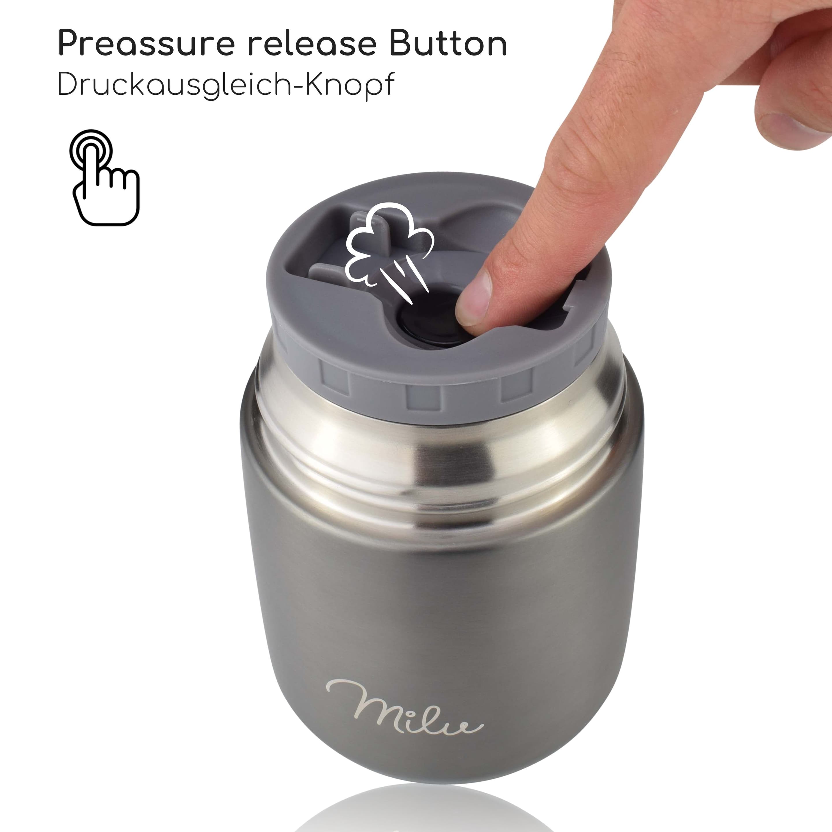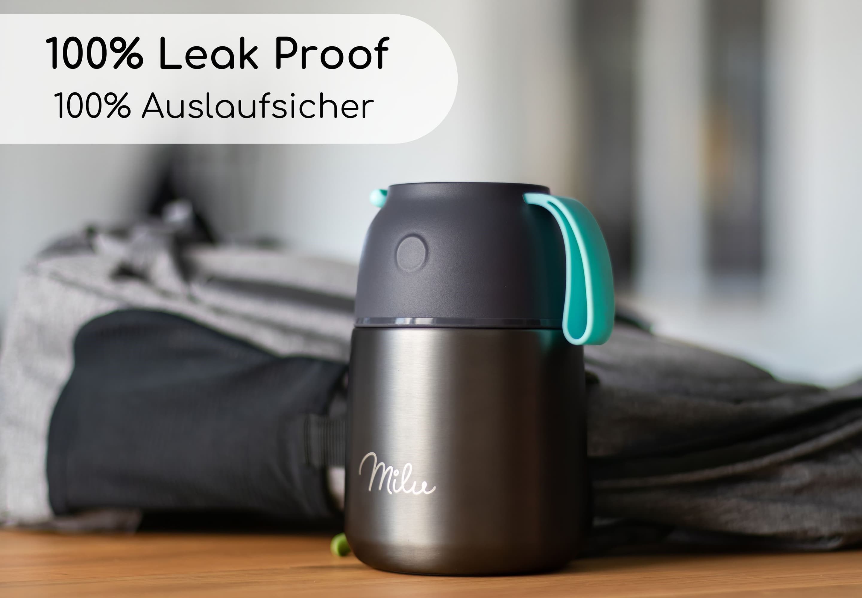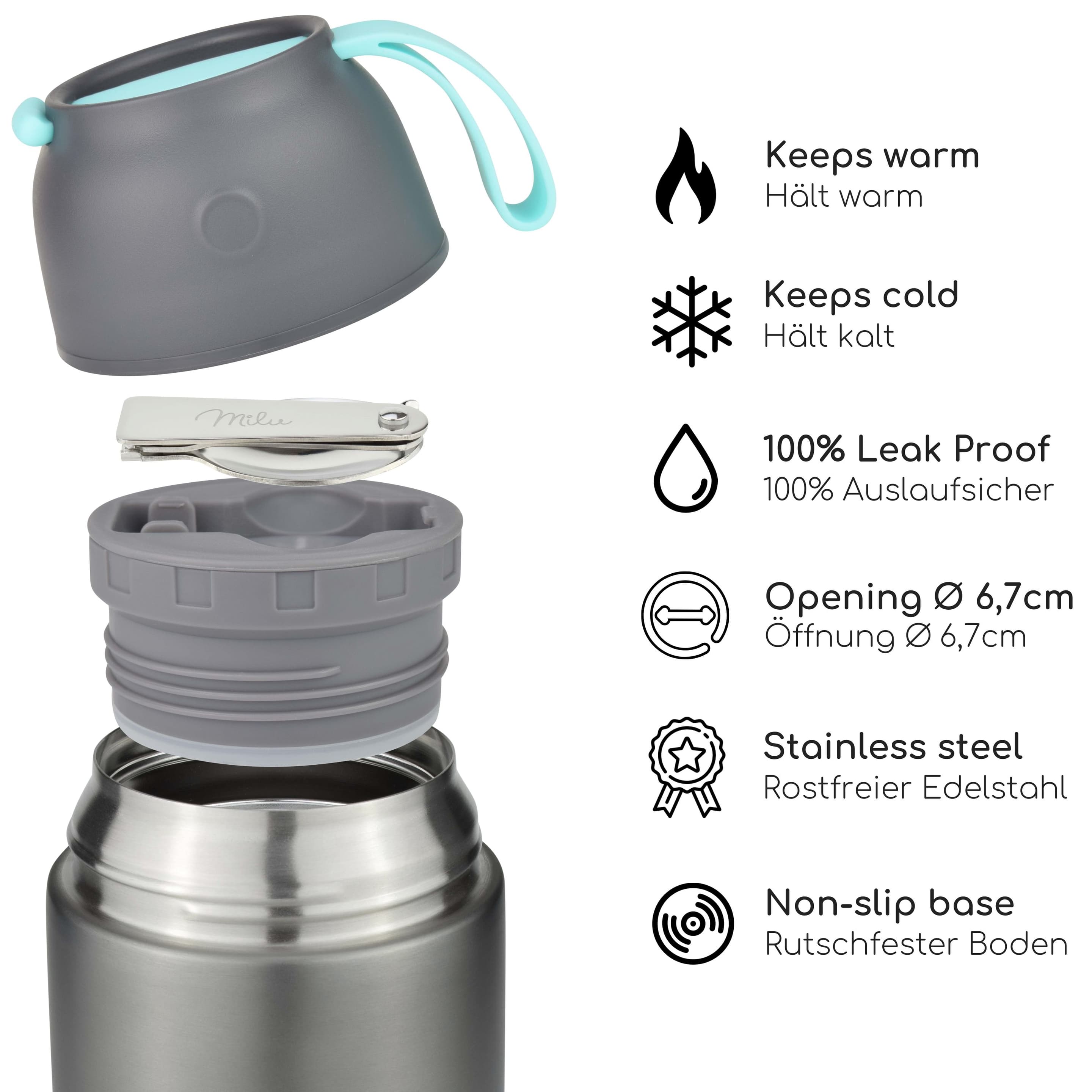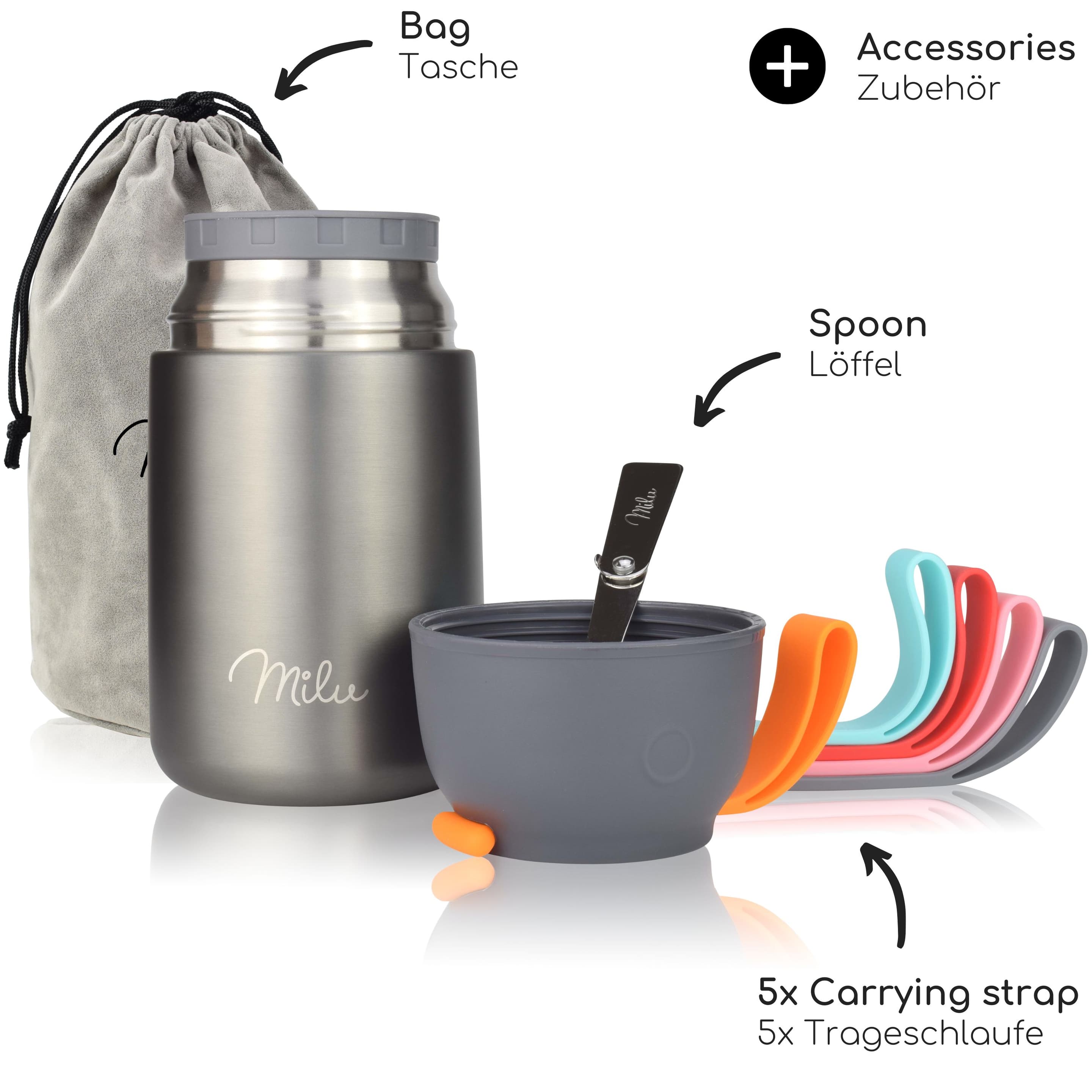 Ein Plus für die Umwelt und für eine bessere Zukunft. Mit dem Thermobehälter aus Edelstahl von Milu unterstützen Sie nachhaltig unsere Umwelt und helfen Umweltverschmutzung durch Einweg-Geschirr zu vermeiden. So zeigen Sie Respekt vor der Natur und einen bewussten Lifestyle. Lieber frisch als FastFood, Fertiggerichte und teure Snacks. Das Thermobehälter- / Lunchbox-Set – in der Freizeit, Arbeit, Schule, auf Reisen – immer gut versorgt. Modernes Design, stylisch, funktionale Mehrwerte und hochwertig in der Verarbeitung – dafür steht Milu. Unsere Produkteigenschaften: Immer erhalten Sie ein Milu Extra: Mitgeliefert werden hier ein schöner Aufbewahrungsbeutel für Reisen, eine Trageschlaufe in 5 verschiedenen Farben, eine passende Reinigungsbürste, einen klappbaren Edelstahl-Esslöffel und eine Ersatzdichtung. Die ideale Begleitung für unterwegs. Beispielsweise beim Wandern, auf langen Fahrten im Auto / Zug / Bahn oder bei der Arbeit. Die Einsatzmöglichkeiten sind unbegrenzt. Für jede Outdoor-Aktivität sind die Thermobehälter geeignet. Hält Ihre Speisen / Suppen / Babynahrung lange heiß oder kalt.