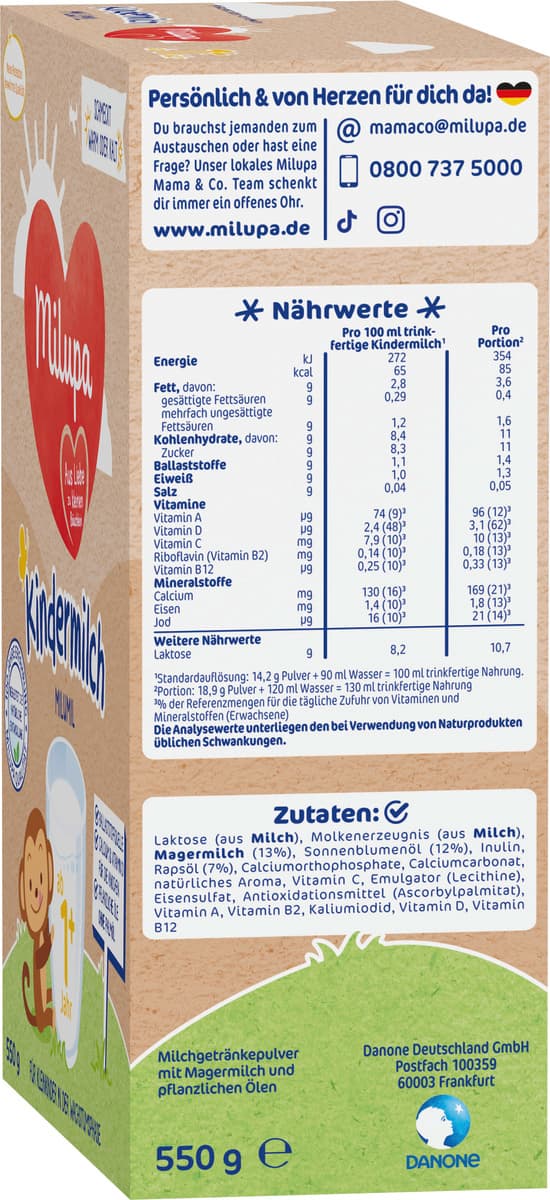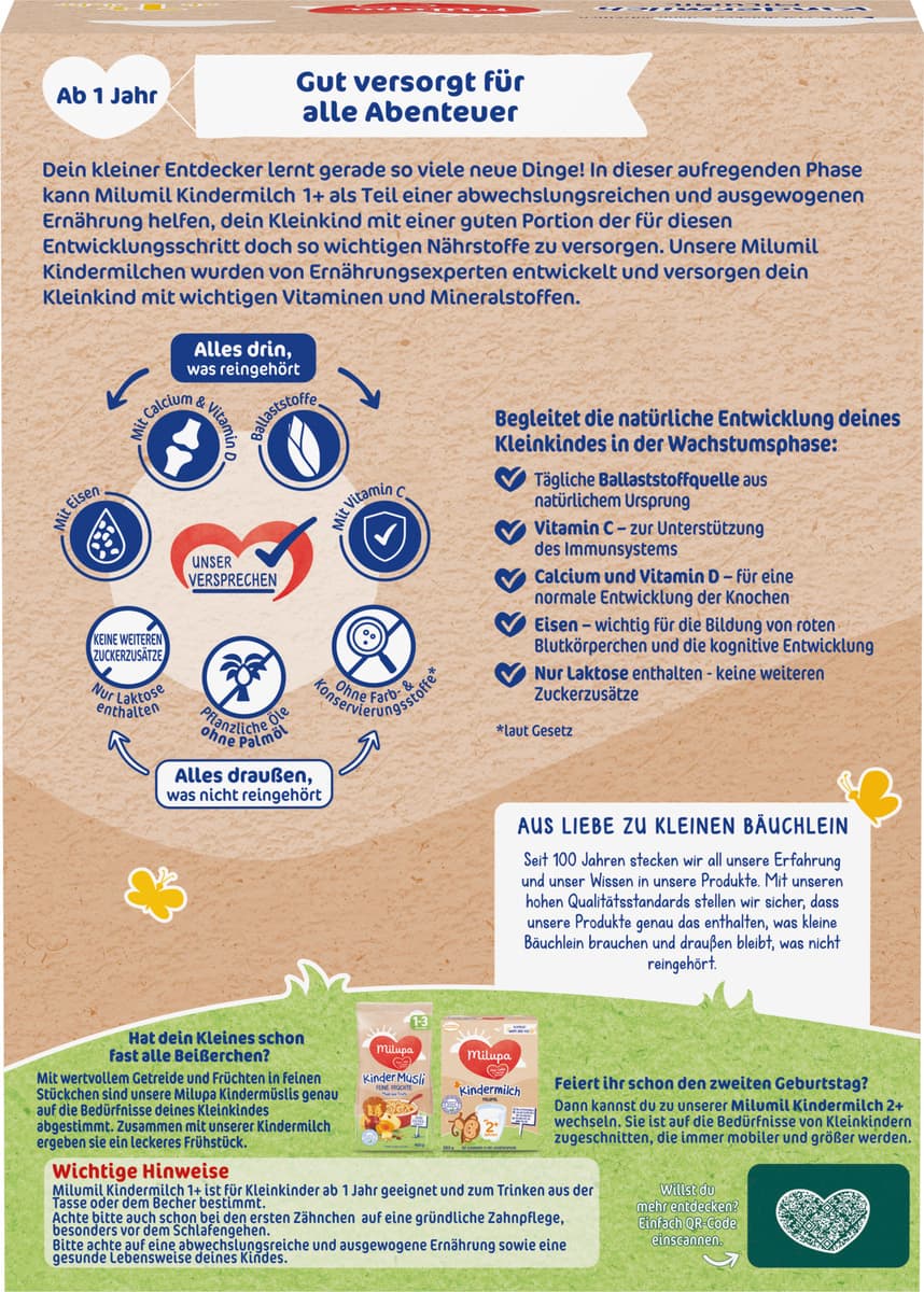 FÜR KLEINE ABENTEURER Nie mehr wird dein Kind so schnell wachsen wie jetzt! Als Teil einer abwechslungsreichen und ausgewogenen Ernährung kann Milumil Kindermilch 2+ dazu beitragen, dein Kleinkind mit einer guten Portion der für diesen Entwicklungsschritt doch so wichtigen Nährstoffe zu versorgen. Hat dein Kleines schon fast alle Beißerchen? Mit wertvollem Getreide und Früchten in feinen Stückchen sind unsere Milupa Kindermüslis genau auf die Bedürfnisse deines Kleinkindes abgestimmt. Zusammen mit unserer Kindermilch ergeben sie ein leckeres Frühstück. Ballaststoffquelle Calcium & Vitamin D für die Knochen Pflanzliche Öle ohne Palmöl Dein kleiner Entdecker lernt gerade so viele neue Dinge! In dieser aufregenden Phase kann Milumil Kindermilch 2+ als Teil einer abwechslungsreichen und ausgewogenen Ernährung helfen, dein Kleinkind mit einer guten Portion der für diesen Entwicklungsschritt doch so wichtigen Nährstoffe zu versorgen. Unsere Milumil Kindermilchen wurden von Ernährungsexperten entwickelt und versorgen dein Kleinkind mit wichtigen Vitaminen und Mineralstoffen. AUS LIEBE ZU KLEINEN BÄUCHLEIN Seit 100 Jahren stecken wir all unsere Erfahrung und unser Wissen in unsere Produkte. Mit unseren hohen Qualitätsstandards stellen wir sicher, dass unsere Produkte genau das enthalten, was kleine Bäuchlein brauchen und draußen bleibt, was nicht reingehört. Begleitet die natürlichen Entwicklungsstufen deines Kleinkindes in der Wachstumsphase: Tägliche Ballaststoffquelle aus natürlichem Ursprung Vitamin C - zur Unterstützung des Immunsystems Calcium und Vitamin D - für eine normale Entwicklung der Knochen Eisen - wichtig für die Bildung von roten Blutkörperchen und die kognitive Entwicklung Nur Laktose enthalten - keine weiteren Zuckerzusätze * laut Gesetz