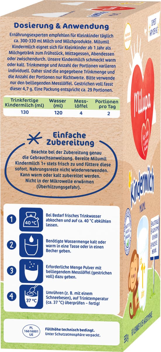 | Zubereitungshinweis | Ernährungsexperten empfehlen für Kleinkinder täglich ca. 300-330 ml Milch und Milchprodukte. Milumil Kindermilch eignet sich für Kleinkinder ab 2 Jahren als Milchgetränk zum Frühstück, Mittagessen, Abendessen oder zwischendurch. Unsere Kindermilch schmeckt warm oder kalt. Trinkmenge und Anzahl der Portionen variieren individuell. Daher sind die angegebenen Trinkmengen und die Anzahl der Portionen nur Richtwerte. Bitte verwende nur den beiliegenden Messlöffel. Gestrichen voll fasst dieser 4,6 g. Eine Packung entspricht ca. 29 Portionen. NEUE DOSIERUNG Trinkfertige Kindermilch (ml): 130, Wasser (ml): 120, Messlöffel: 4, Portion pro Tag 2 EINFACHE ZUBEREITUNG Beachte bei der Zubereitung genau die Gebrauchsanweisung. Bereite Milumil Kindermilch 2+ stets frisch zu und füttere diese sofort. Nahrungsreste nicht wiederverwenden. Kann warm oder kalt zubereitet werden. Nicht in der Mikrowelle erwärmen (Überhitzungsgefahr). 1.Bei Bedarf frisches Trinkwasser abkochen und auf ca. 40°C abkühlen lassen. 2.Benötigte Wassermenge kalt oder warm in eine Tasse oder in einen Becher geben. 3.Erforderliche Menge Pulver mit beiliegendem Messlöffel (gestrichen voll) dazu geben. 4.Umrühren (z.B. mit einem Schneebesen), auf Trinktemperatur (ca. 37 °C) überprüfen – fertig! |