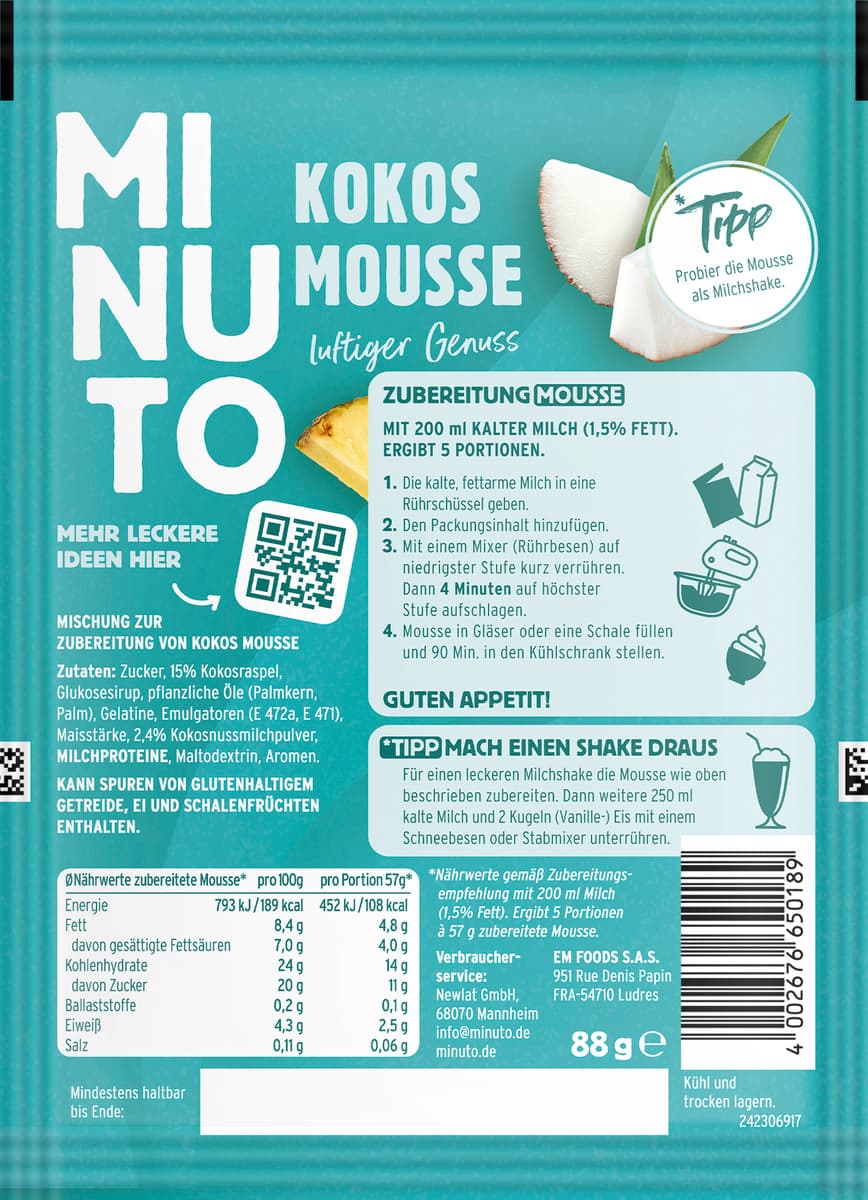 | Zubereitungshinweis | Zubereitung Mousse mit 200 ml kalter Milch (1,5 % Fett). Ergibt 5 Portionen. 1. Die kalte, fettarme Milch in eine Rührschüssel geben. 2. Den Packungsinhalt hinzufügen. 3. Mit einem Mixer (Rührbesen) auf niedrigster Stufe kurz verrühren. Dann 4 Minunten auf höchster Stufe aufschlagen. 4. Mousse in Gläser oder eine Schale füllen und 90 Min. in den Kühlschrank stellen. |