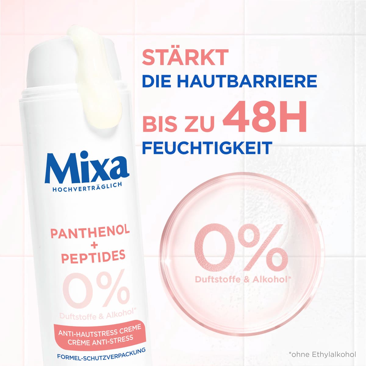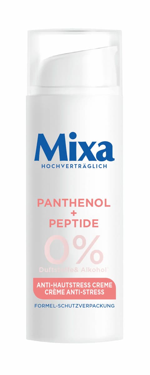Die Mixa Anti-Hautstress Feuchtigkeitsspendende & regenerierende Creme wurde speziell für die Bedürfnisse gestresster Haut entwickelt. Sie zeichnet sich durch einen Wirkstoff-Komplex aus beruhigendem Panthenol sowie Peptiden aus, um die Hautbarriere zu stärken und gleichzeitig Haut-Reaktionen, wie Rötungen, Irritationen, Hautreizungen und Trockenheit, zu mildern. Die Feuchtigkeitspflege für Gesicht und Augen versorgt die Haut bis zu 48 Stunden intensiv mit Feuchtigkeit und besitzt eine erfrischende und leichte Textur. Diese zieht schnell in die Haut ein, ohne zu fetten oder Rückstände zu hinterlassen. Darüber hinaus ist die Formel frei von Duftstoffen und Alkohol und ist damit besonders sanft zur Haut.