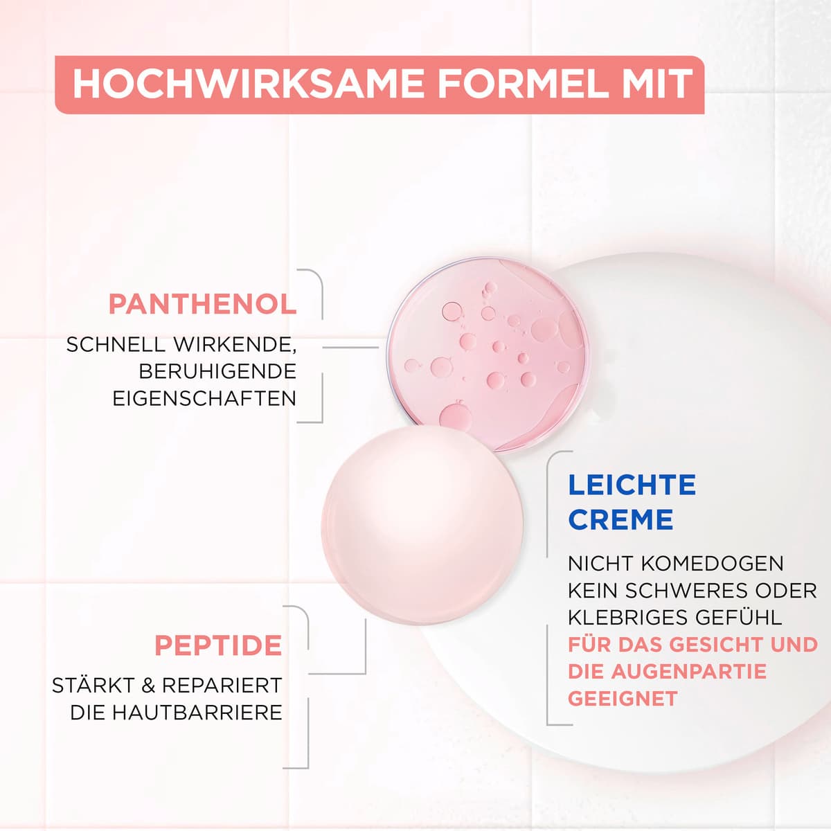 • Die Formel mit beruhigendem Panthenol und Peptiden besitzt eine positive Wirkung auf die Hautbarriere, um diese zu stärken