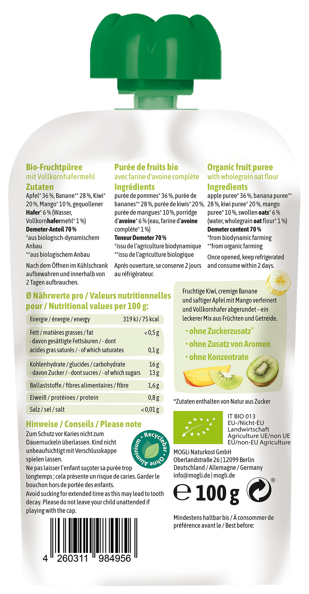 | Zutaten | Demeter-Anteil 72 %: Apfel* 36 %, Banane** 28 %, Kiwi* 20 %, Mango* 10 %, gequollener HAFER* 6 % (Wasser, VollkornHAFERmehl* 1 %) *aus biologisch-dynamischem Anbau **aus biologischem Anbau |