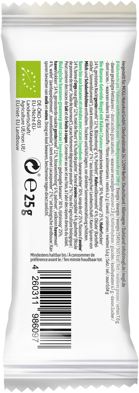 | Zutaten | getrocknete Bananen* 30%, Reissirup* 25%, HAFERFLOCKEN* 14%, geröstetes NACKTGERSTENMEHL* 12%, Blütenhonig* 6%, Palmfett*, HAFERVOLLKORNMEHL* 4%, Oblate* (Kartoffelstärke*, Sonnenblumenöl*), stark entöltes Kakaopulver* 2% |