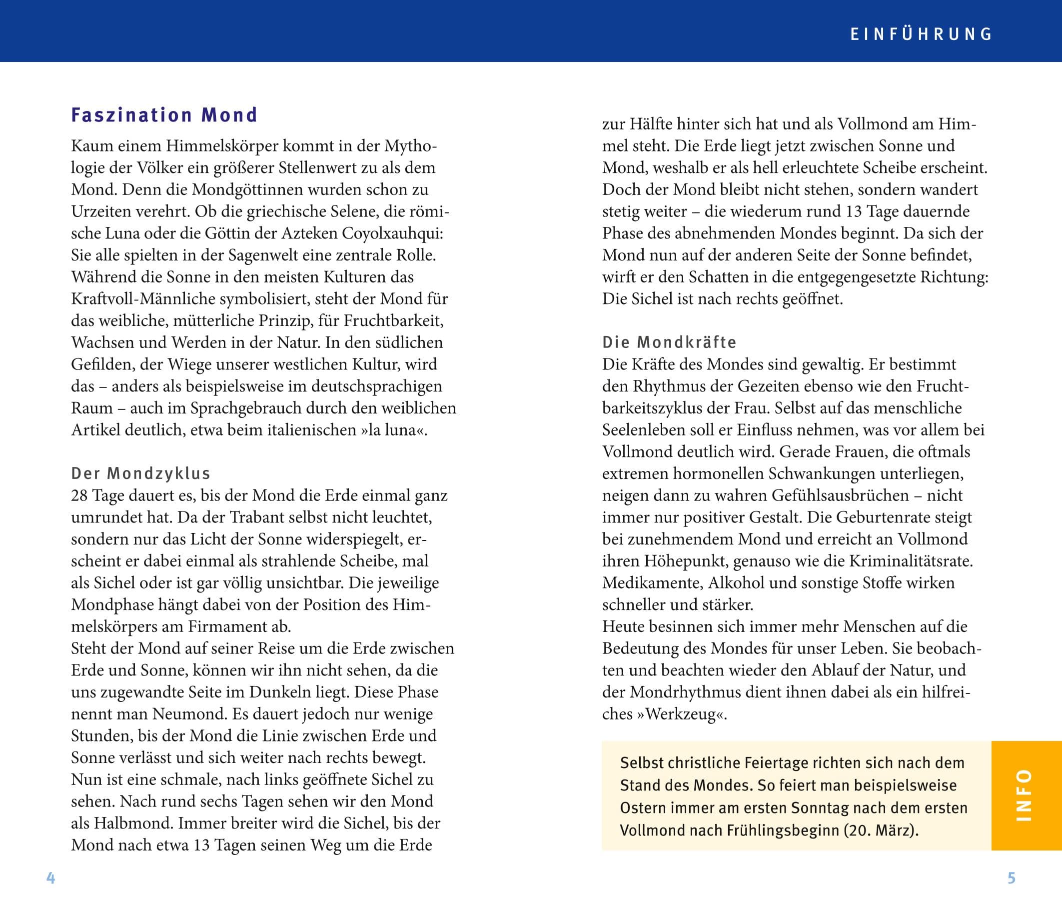 Leben nach dem Mond Welcher Tag ist perfekt zum Haare schneiden? Oder wann ist der Start einer Abnehmkur am erfolgreichsten? Der handliche Taschenkalender von Andrea Lutzenberger enthält über 30 Symbole, die Ihnen auf einem Blick verraten, wann die besten Zeitpunkte sind, um"Körper&Seele"zu verwöhnen oder Arbeiten im"Haushalt"und"Garten"zu erledigen. Als täglicher Begleiter bietet er auf einer Doppelseite pro Woche genügend Platz für eigene Notizen und liefert durch die farbigen Symbole rasch die gewünschten Informationen. Für den schnellen Zugriff gibt es am Ende des Kalenders eine praktische Einmerk-Klappe, auf der noch einmal alle Symbole erklärt werden. Bleiben dennoch wichtige Fragen rund um den Mondkalender offen, hilft die Telefon-Hotline kompetent weiter.