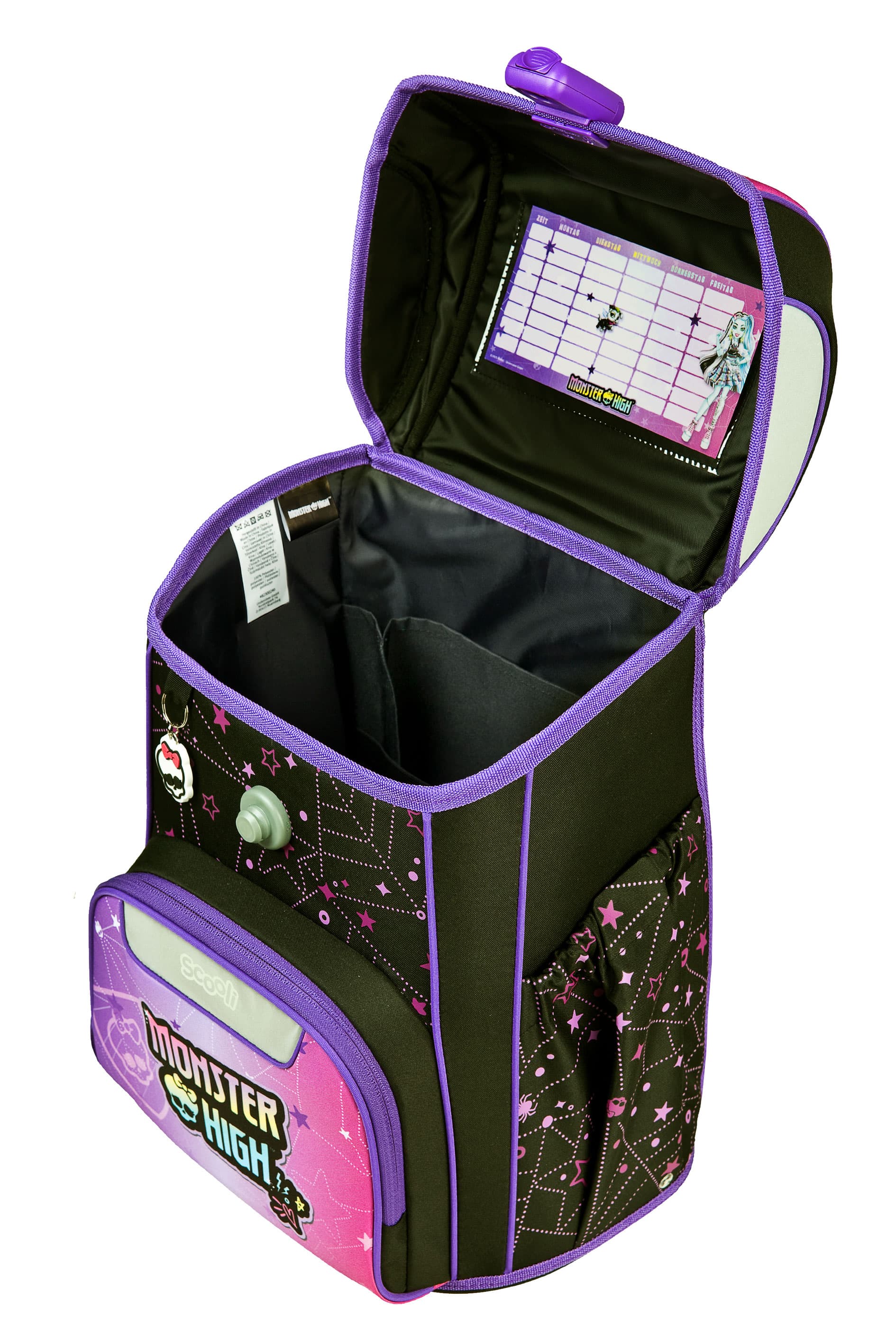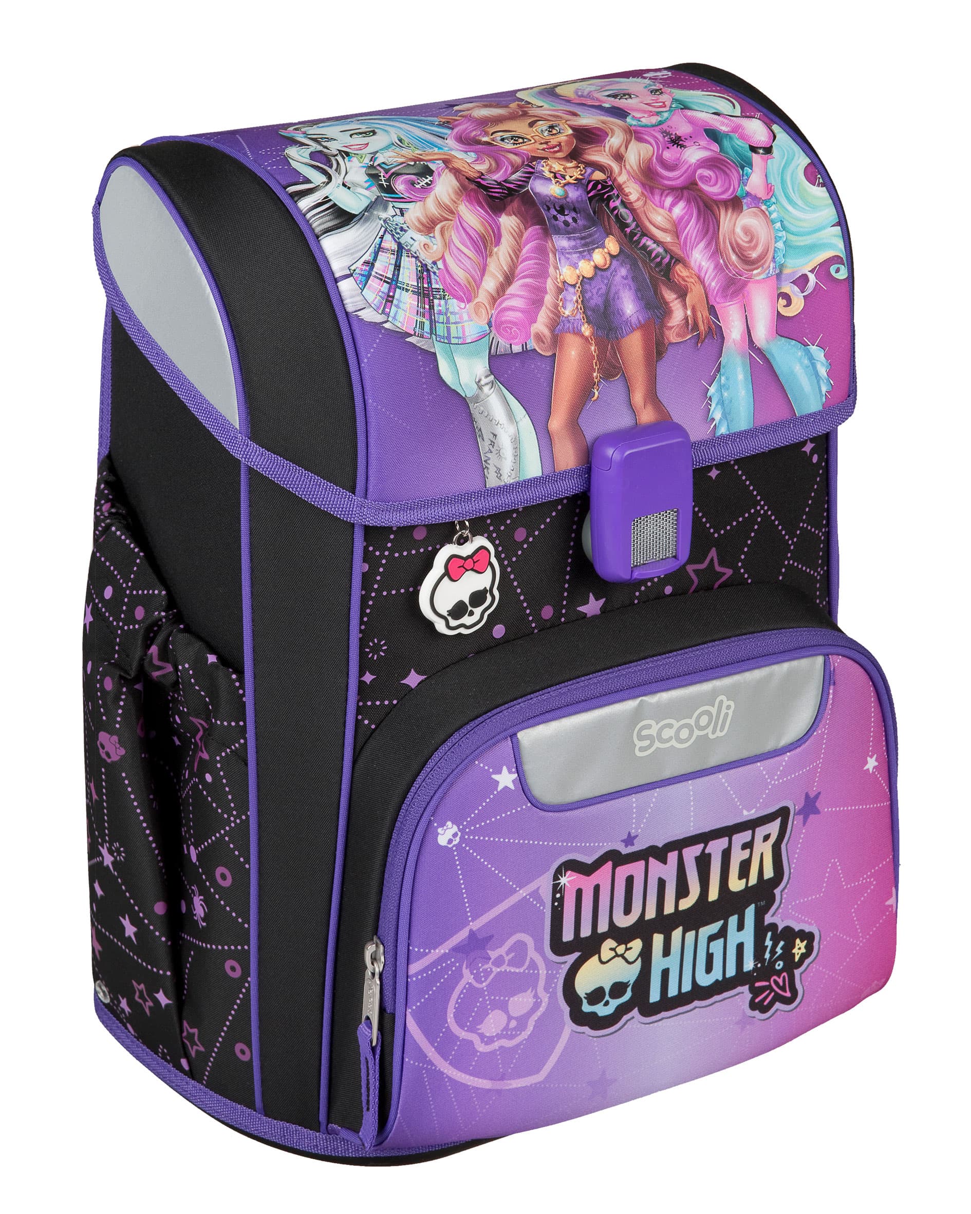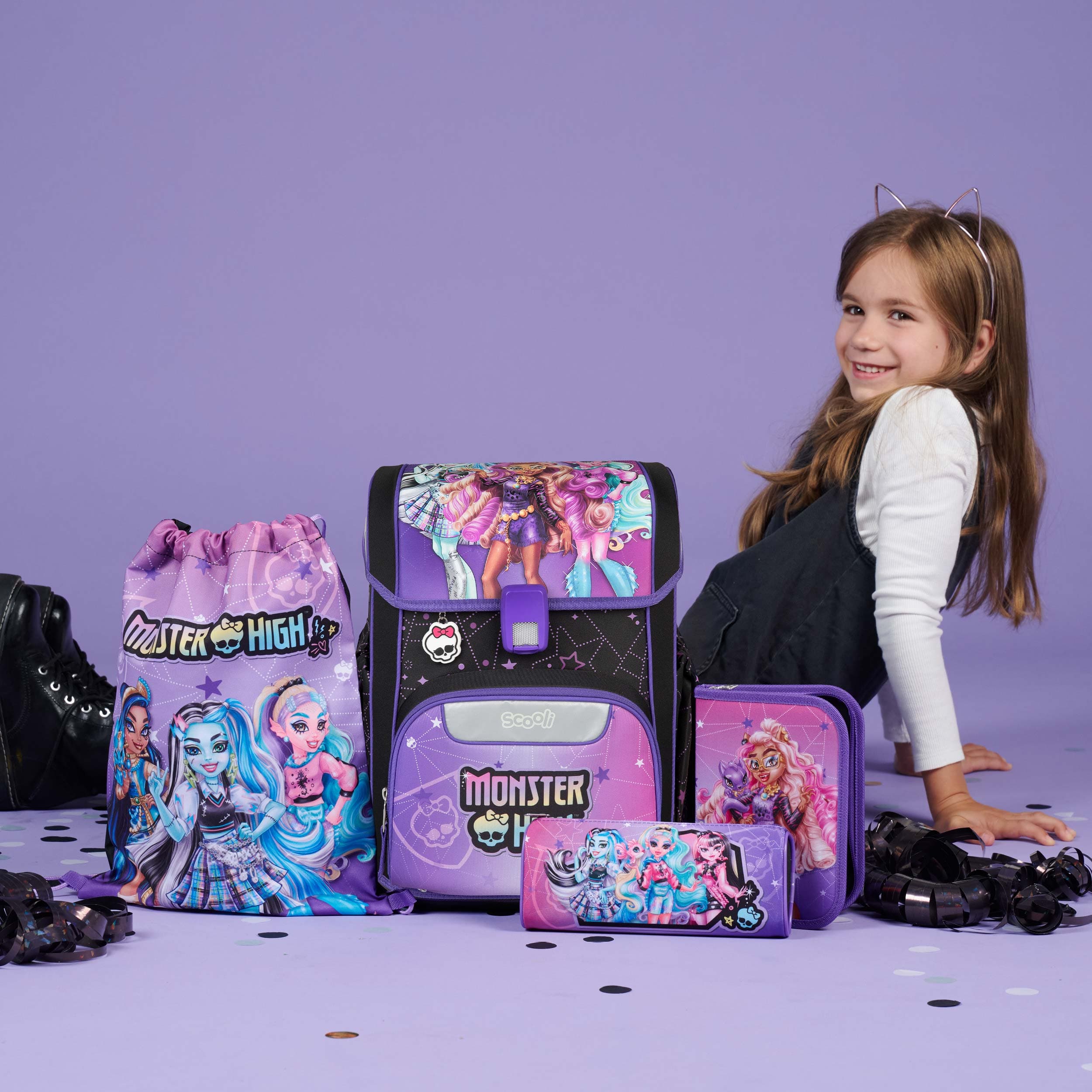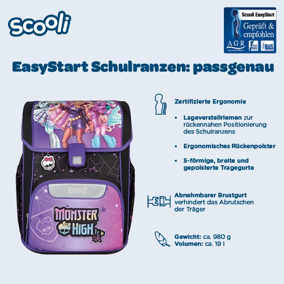 Der Scooli EasyStart Schulranzen im beliebten Monster High Design begeistert mit einem rebellischen Look und durchdachter Ergonomie: Ausgezeichnet mit dem Gütesiegel Aktion Gesunder Rücken e.V. (AGR), lässt sich der Ranzen individuell an die Anatomie des Kindes anpassen. Mit nur ca. 980 g Gewicht ist er besonders leicht und durch sein schlankes Design ideal für Schulanfänger. Ein ergonomisches, atmungsaktives Rückenpolster, ein abnehmbarer Brustgurt und Lageverstellriemen sorgen für einen komfortablen, rückenschonenden Sitz. Der Scooli Schulranzen besteht aus hochwertig verarbeiteten, strapazierfähigen Materialien, die dem bunten Schulalltag mühelos standhalten. Das praktische Magnetschloss ermöglicht ein kinderleichtes Öffnen und Schließen des Deckels. Für Sicherheit im Straßenverkehr sorgen rundum integrierte Reflektoren, die auch bei Dunkelheit und schlechtem Wetter für gute Sichtbarkeit sorgen. Das 5-teilige Schulranzen-Set enthält den EasyStart Schulranzen, ein befülltes Schüleretui mit hochwertigen Buntstiften von Eberhard-Faber, einen Turnbeutel, ein Schlamperetui sowie einen abnehmbaren Schlüsselanhänger. Mit seinem rebellischen Monster High Design ist dieser offizielle Lizenz-Schulranzen die perfekte Wahl für alle Fans der frechen Monsterpuppen-Clique. Inklusive 3 Jahren Garantie vom Hersteller.