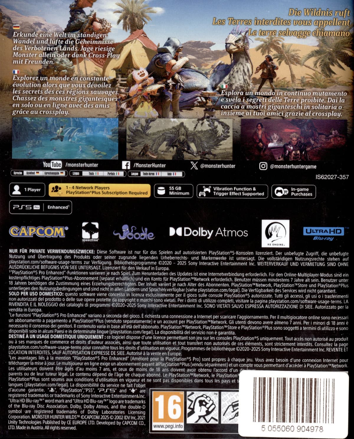 Die Schicksale eines Volkes und der Natur sind miteinander verwoben. Im Mittelpunkt stehen ein Junge namens Nata und der mysteriöse Weiße Geist. Vor einigen Jahren wurde ein Junge namens Nata an der Grenze zum Verbotenen Land entdeckt, einer unbekannten Region, welche die Gilde für unbewohnt hielt. Nata erzählt, wie sein Dorf von einem mysteriösen Monster angegriffen wurde. Daraufhin organisierte die Gilde eine Expedition, um Nachforschungen anzustellen. Der Jäger wird einer der Einheiten zugeteilt, die den „Weißen Geist“ untersuchen und Natas Volk, die Hüter, retten sollen. Ein wildes und unerforschtes Gebiet, das dir alles abverlangt. • Erlebe dynamische Umgebungen im steten Wandel. Erlebe eine Geschichte von Monstern und Menschen in einer Welt mit zwei Seiten: auf der einen raues und unbarmherziges Land, wo Monster um knappe Ressourcen kämpfen, und auf der anderen üppige Natur voller Leben. • Du spielst einen professionellen Monsterjäger, stets auf das Gleichgewicht des Ökosystems bedacht. Nutze die auf der Jagd erbeuteten Ressourcen, um immer mächtigere Waffen und Rüstungen herzustellen und die Geheimnisse dieser fremden Lande zu lüften. • Mach dich gefasst auf das bisher ausgefeilteste und packendste Spielerlebnis der Monster Hunter-Reihe. Audio: Japanisch, Englisch, Französisch, Italienisch, Deutsch, Spanisch (Spanien), Russisch, Portugiesisch (Brasilien) Texte: Japanisch, Englisch, Französisch, Italienisch, Deutsch, Spanisch (Spanien), Spanisch (Lateinamerika), Russisch, Portugiesisch (Brasilien), Arabisch, Polnisch