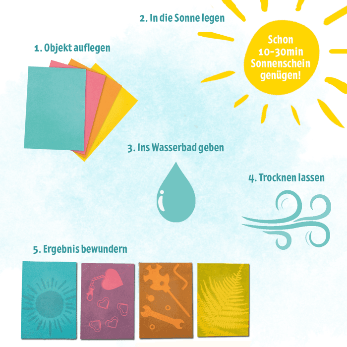 Das Papier ist mit einer speziellen Beschichtung versehen, die durch UV-Licht ihre Farbe verändert. So wird spielerisch das wissenschaftliche Prinzip des Sonnendrucks erfahrbar. Perfekt für kleine Entdecker*innen und kreative Köpfe!
