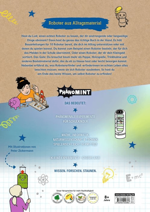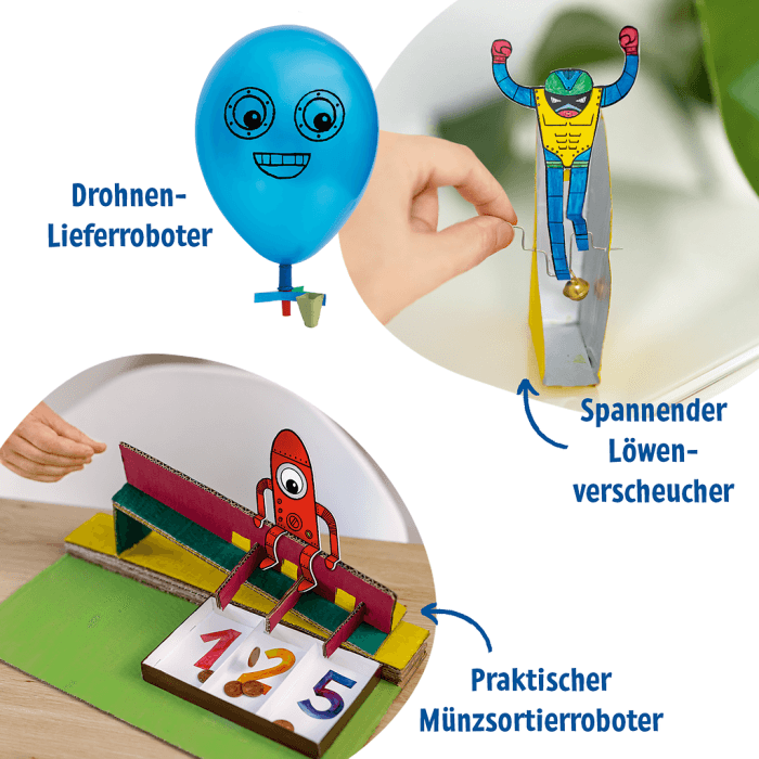 Wie funktionieren Roboter – und kann man sie selbst bauen? Dieses Buch liefert die Antworten! Mit 10 spannenden Anleitungen entstehen aus einfachen Materialien wie Gummibändern, Pappe oder Münzen kleine Maschinen, die faszinierende Aufgaben übernehmen. Ob Münzsortierer, Eierklopfer oder ein Aufzeigeroboter, der in der Schule das Melden übernimmt – hier wird Tüfteln zum Abenteuer!