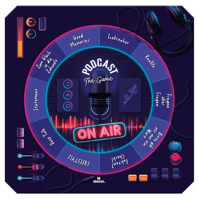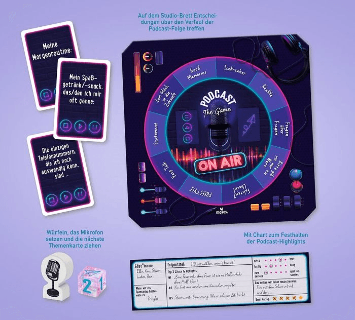 Das Spielbrett im Design eines Podcast-Studios, ein Mikrofon als Spielfigur und ein praktisches Chart zum Festhalten eurer Highlights machen das Spiel zu einem echten Erlebnis für Freund*innen, Familie und Podcast-Fans.