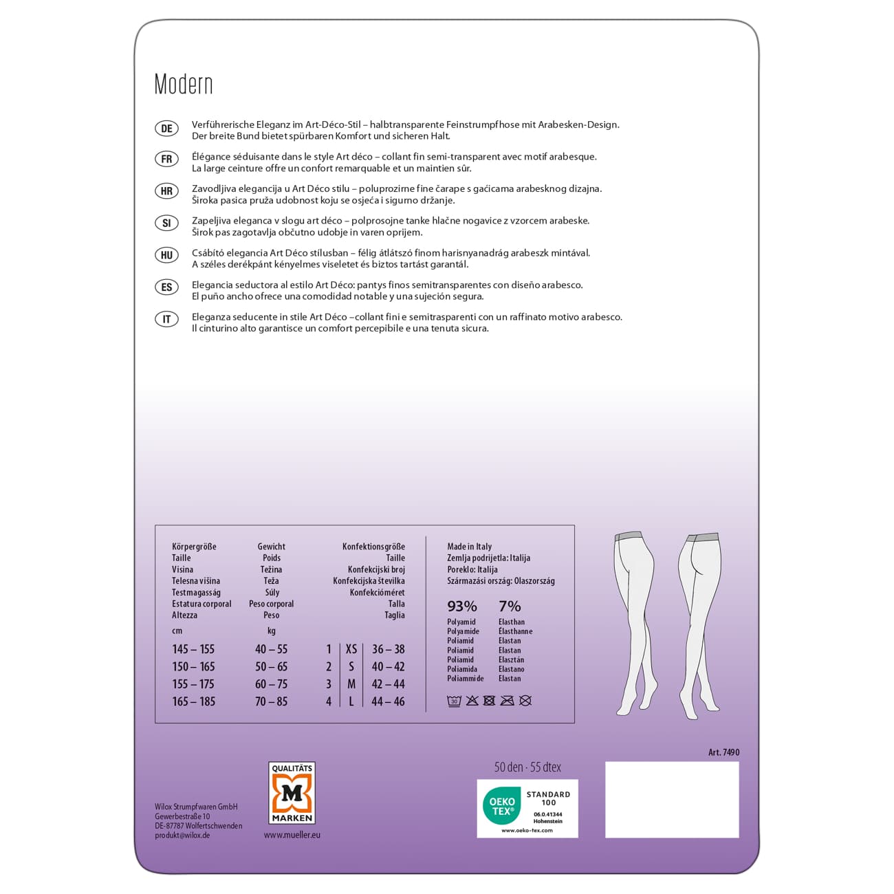 Verführerische Eleganz im Art-Déco-Stil – halbtransparente Feinstrumpfhose mit Arabesken-Design. Der breite Bund bietet spürbaren Komfort und sicheren Halt.