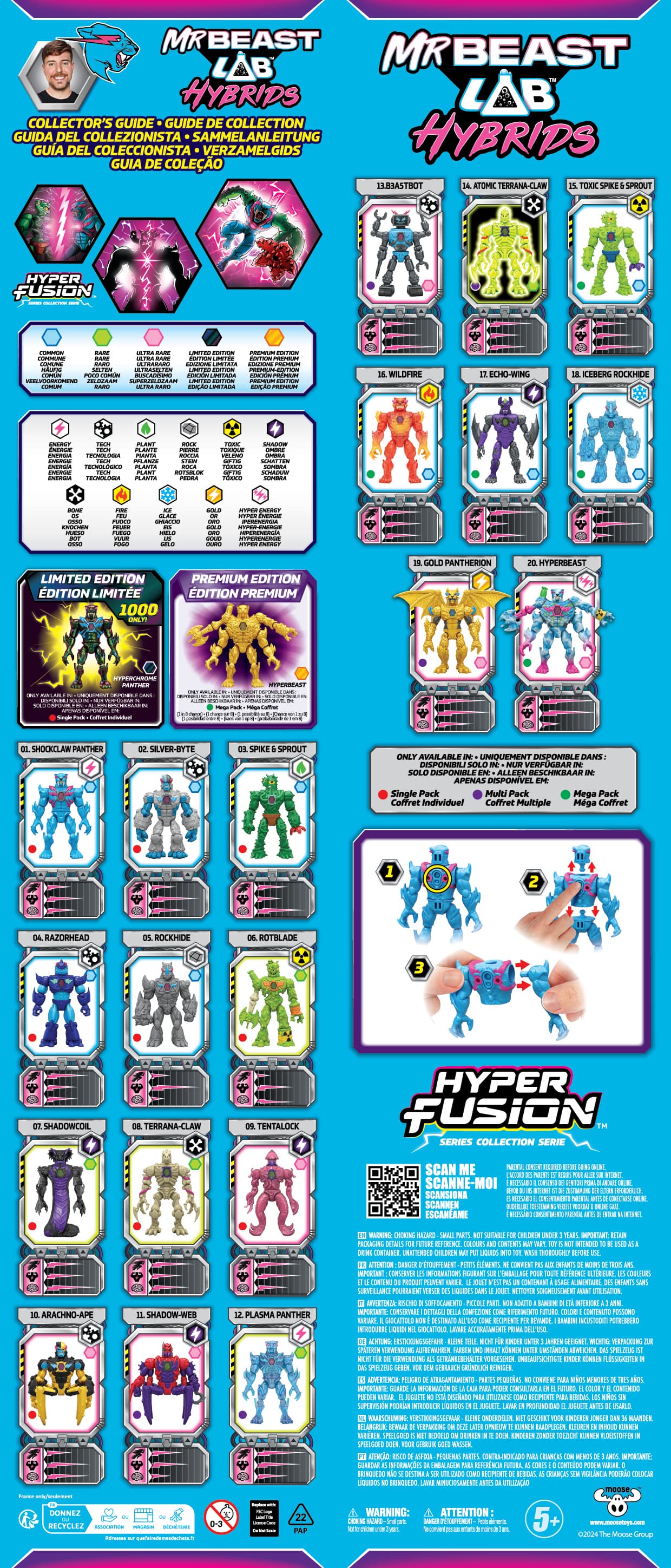 Zum allerersten Mal kannst du MrBeasts Labor betreten und das ultimative Monster erschaffen! Mit MrBeast Lab Hybrids liegt die Macht der Fusion in deinen Händen – baue aus zahlreichen Kombinationen die ultimative MrBeast-Actionfigur! Das Ganze beginnt mit dem MrBeast Lab-Behälter: Drehe und öffne den Deckel, um einen Streifen versiegelter Folienbeutel herauszuziehen. Reiße sie auf, um drei einzelne Monsterteile zu enthüllen, und kombiniere sie miteinander, um einen von 10 verschiedenen MrBeast Hybrid-Charakteren aus den Einzelpackungen zu erschaffen. Sammle über 30 Monster, inklusive der seltenen und ultraseltenen Edition, Premium-Edition sowie der Limited Edition mit dem legendären Hybrid Hyperchrome Panther (nur 1.000 Stück verfügbar!). Das Rennen um die ultimative Sammlung ist eröffnet! Mit einer Größe von 10,16 cm und 10 beweglichen Gelenken sind die MrBeast Lab Hybrids bereit für Action und sorgen für ultimativen Spielspaß! Jede Einzelpackung enthält ein komplettes Hybrid-Monster, das im Inneren versteckt ist und nur darauf wartet, entdeckt zu werden. Kombiniere, gestalte und erweitere deine MrBeast Lab Hyper Fusion-Sammlung noch heute! Schau dir auch die brandneuen Animationsvideos von MrBeast Lab auf YouTube an und erlebe die Hybrids in Aktion!