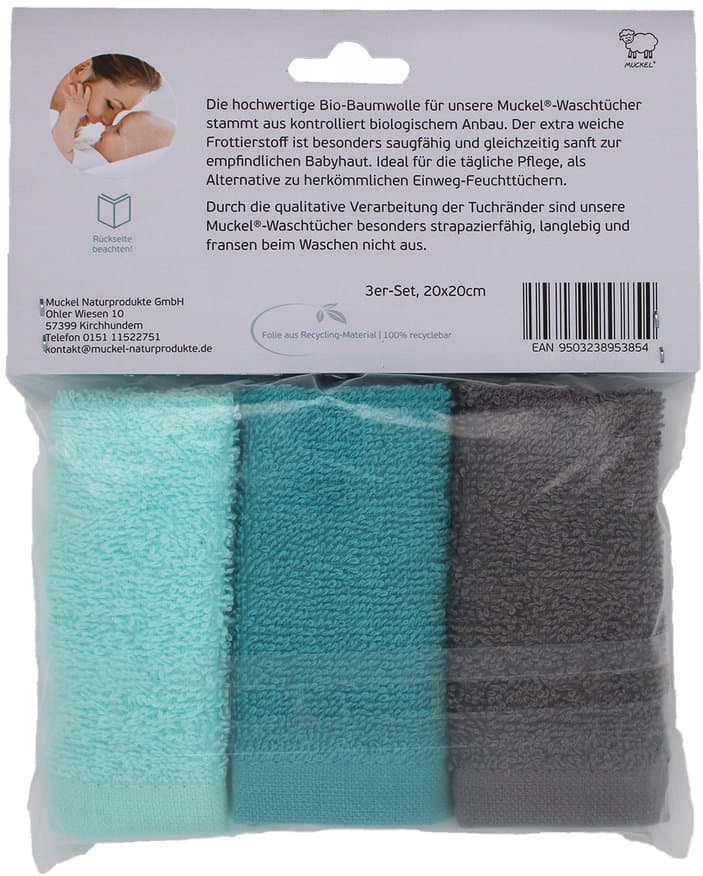 Unsere neuen Bio-Waschtücher werden aus hochwertiger Bio-Baumwolle aus kontrolliert biologischem Anbau hergestellt. Der extra weiche Frottierstoff ist besonders saugfähig und gleichzeitig sanft zur empfindlichen Babyhaut. Ideal für die tägliche Pflege, als Alternative zu herkömmlichen Einweg-Feuchttüchern. Durch die qualitative Verarbeitung der Tuchränder sind unsere Muckel®-Waschtücher besonders strapazierfähig, langlebig und fransen beim Waschen nicht aus.