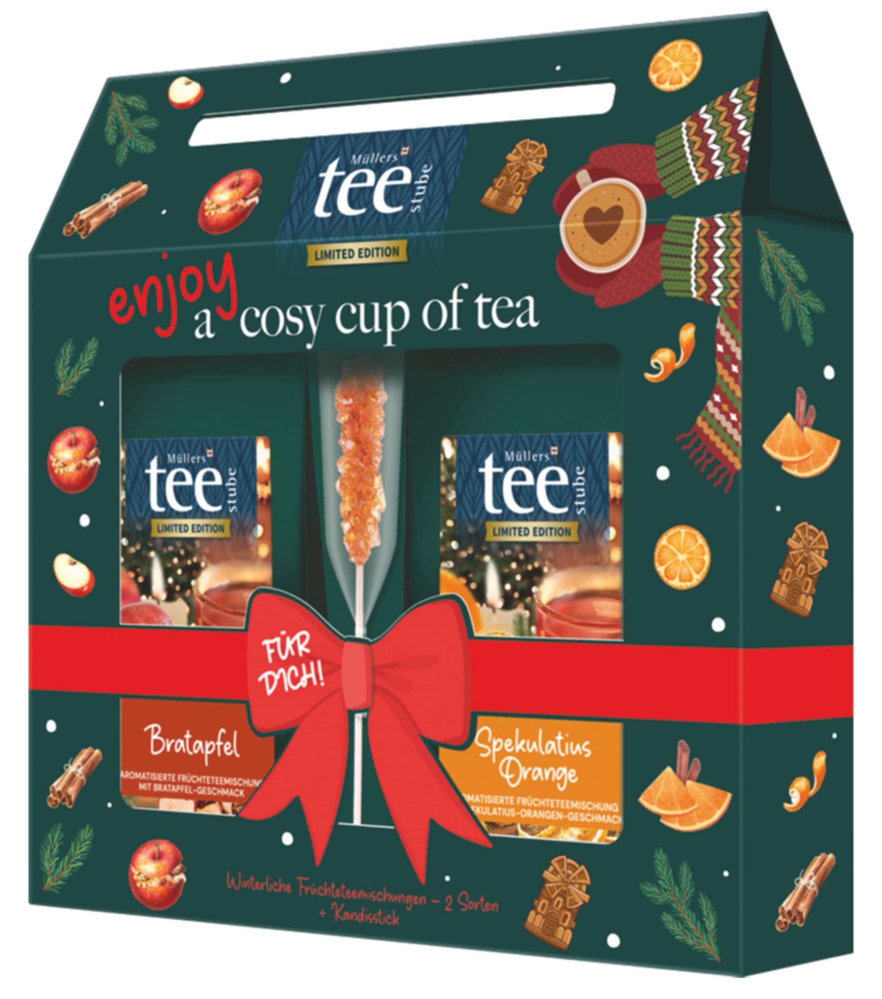 | Zutaten | Früchtetee Spekulatius Orange: Zutaten: Apfelstücke, Hibiskusblüten, Weinbeeren, Hagebuttenschalen, Orangenschalen (5%), Hagebuttenkerne, Krokantstücke (Zucker, HASELNÜSSE), Aroma, Koriander, MANDELN gehackt. Früchtetee Bratapfel: Zutaten: Apfelstücke (63%), Hibiskusblüten, Weinbeeren, Zimt (6%), Aroma, Sonnenblumenblütenblätter, Bourbon Vanille-Extrakt. Kandisstick: Zutaten: Kristallzucker, Wasser, natürliches Karamell. |