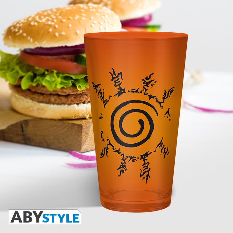 Dieses Naruto Shippuden Glas von ABYstyle stellt das Emblem des Dorfes Konoha und das Siegel dar, mit dem der Kyubi in Naruto gefangen gehalten wird.