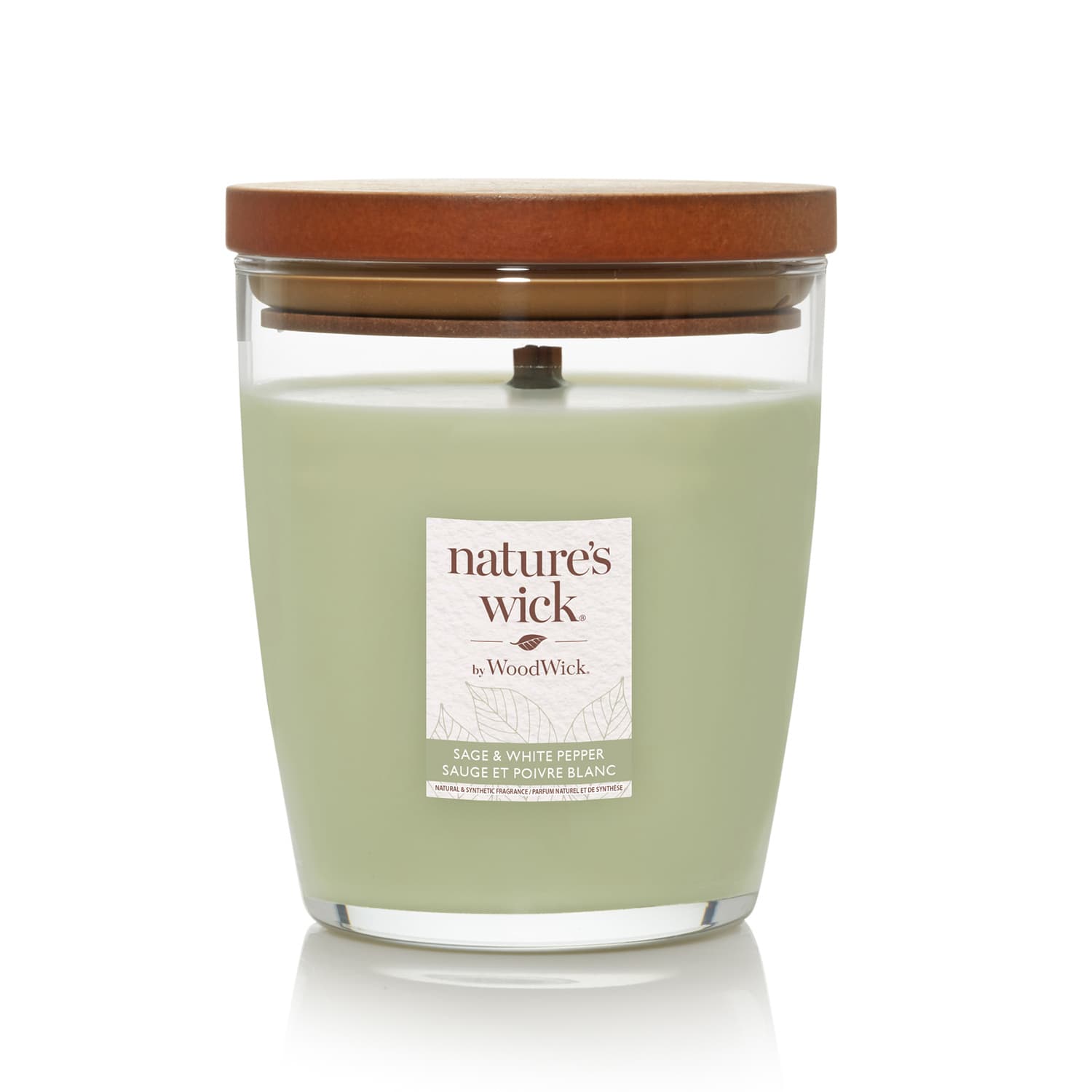 Entdecken Sie Nature’s Wick® by WoodWick®. Duftkerzen mit dem patentierten Holzdocht mit Pluswick®Technologie, der das unverkennbare Geräusch eines knisternden Feuers erzeugt. Erhältlich in einer Reihe von eleganten und von der Natur inspirierten Düften.Die Düfte von Bernstein, Lilie und Salbei kommen zusammen mit Noten von Pfeffer und Vanille.