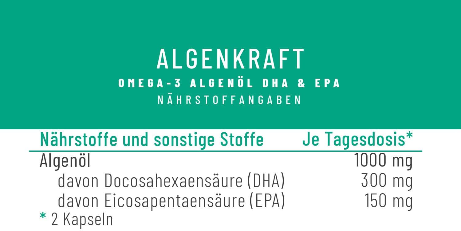 | Zutaten | Algenöl (DHA- und EPA-reiches Öl aus der Mikroalge Schizochytrium sp., Sonnenblumenöl, Antioxidationsmittel (Rosmarin-Extrakt, stark tocopherolhaltige Extrakte natürlichen Ursprungs, Ascorbylpalmitrat)) Überzugsmittel: Hydroxypropylmethylcellulose (pflanzliche Kapselhülle). |
