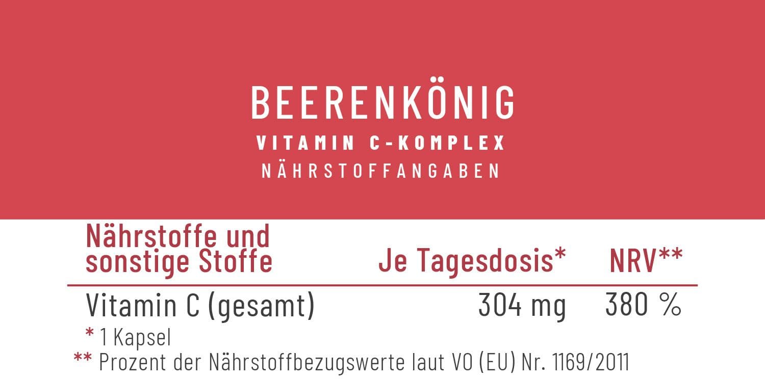 BEERENKÖNIG ist ein Vitamin-C-Supplement aus vier hochwertigen Vitamin-C-Quellen, darunter Acerola-Kirsche, Camu-Camu und Hagebutte. BEERENKÖNIG beinhaltet eine hohe Dosierung von 304 mg Vitamin C pro Kapsel.